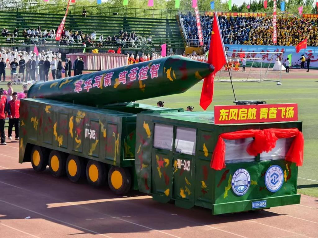 智能工程学院的学子们充分发挥了他们的专业优势,倾注心力与汗水,夜以继日地精心打造导弹模型。他们不仅将深厚的专业知识与满腔的爱国情怀相融合,更在开幕式上呈现出一幅仿佛真实导弹车呼啸而来的震撼场景,为大家在开幕式上呈现出精彩与震撼。