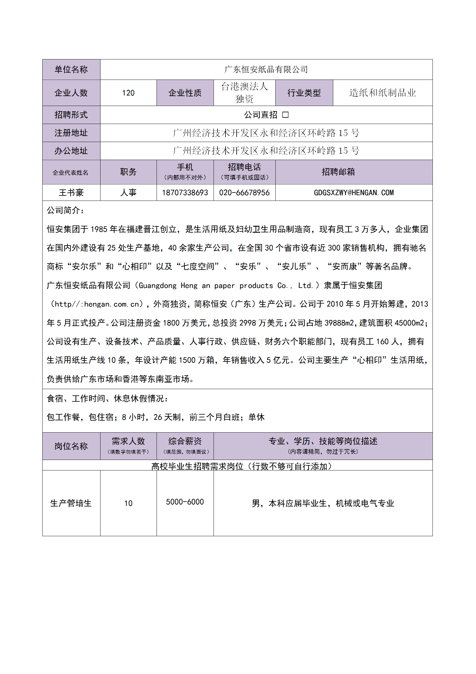 广东恒安纸品有限公司招聘简章
