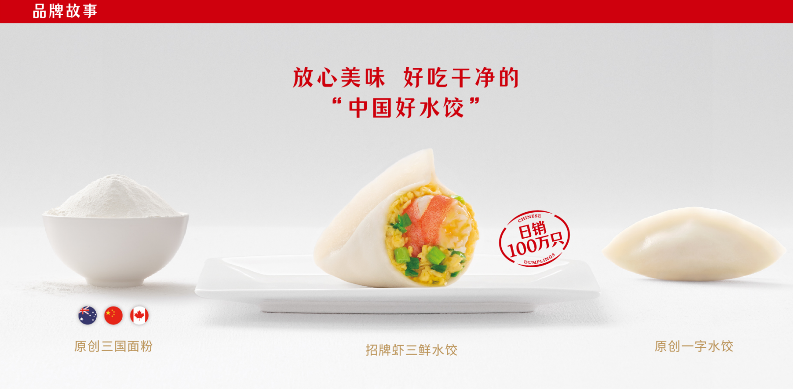 •喜家德原创的一字型水饺工艺、不添加的三国面粉,无论工艺与食材,都致力于为消费者提供放心美味、好吃干净的“中国好水饺”。招牌水饺虾三鲜,日销100万只,已从东北走向全国,也将从中国走向世界。