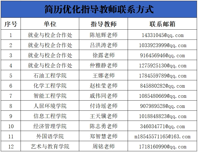 为了帮助毕业生塑造更具竞争力的求职名片,伟德官网就业指导团队特别开设了简历优化快速通道。同学们只需将需要优化的简历发送至指导教师邮箱(详情请见下表),我们的专业教师将在最短的时间内(不超过三个工作日)提供详尽的修改建议,助力您的简历脱颖而出。