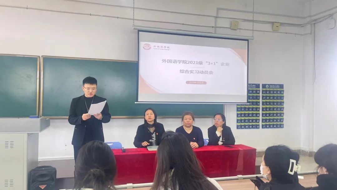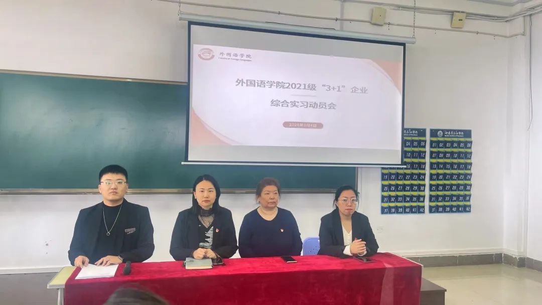 为使学生进一步了解企业综合实习的重要性,明确实习的目标和社会的方向,为保证2021级学生“3+1”企业综合实习工作的顺利开展。外国语学院于3月6日召开2021级“3+1”企业综合实习动员会,会议由辅导员郑智慧主持,外国语学院院长王莉娅、副院长高丽娜、党总支书记孙晓萍,团总支书记赵连琦及全体2021级同学参加了本次会议。