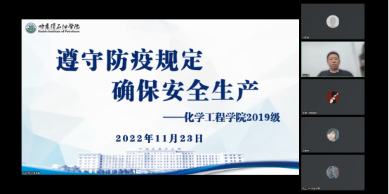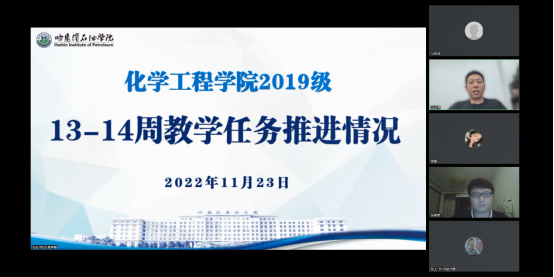 为落实好学生实习阶段教学任务,加强实习学生安全教育和管理工作,2022年11月23日,化学工程学院召开2019级学生第七次主题班会——13-14周教学任务推进情况,会议由学院副院长彭殿宝、辅导员马志强主讲,2019级学生线上参会。
