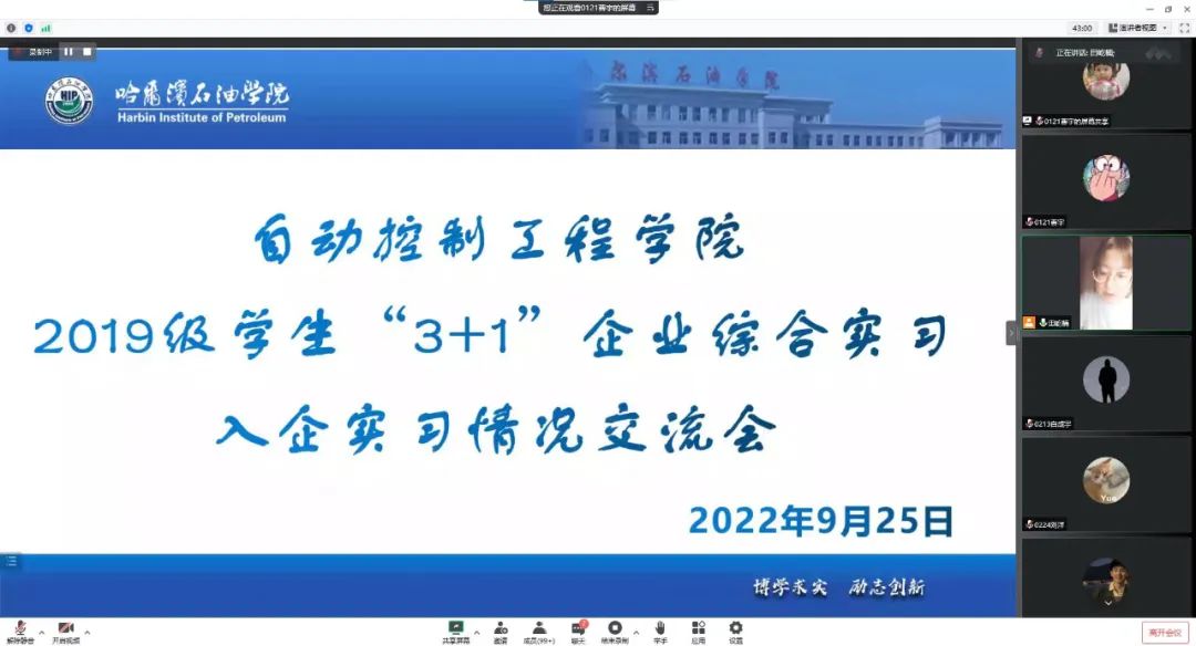 为进一步做好我院2019级学生“3+1”企业实习安全教育工作,确保学生实习安全,进一步强化安全意识,2022年9月25日自动控制工程学院在线上召开2019级学生“3+1”企业实习交流大会。会议由2019级辅导员田屹楠主持,2019级全体学生参加会议。