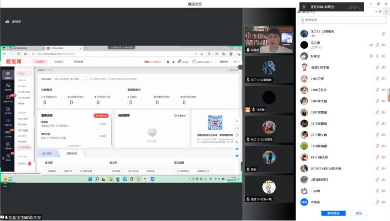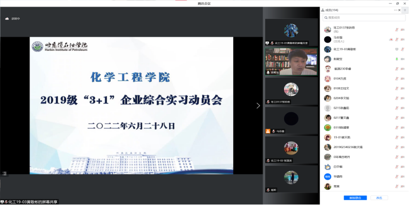 进一步推进高等学校应用型人才培养教学改革进程,提高我院的人才培养质量,全面落实2019级学生“3+1”企业综合实习工作安排,让学生明确实习的目的、意义及要求,2022年6月28日14时30分,化学工程学院通过腾讯会议线上召开2019级“3+1”企业综合实习动员大会,会议由副院长彭殿宝主持,院长杨昕、党总支书记张艳丛、辅导员马志强及2019级全体学生参加。