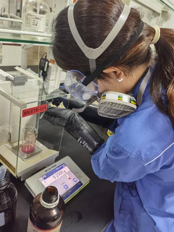 目前我所在的部门是质检中心丙烯腈班组。以前的我从来没有了解过这种化学品,刚开始被分进丙烯腈班组时会有紧张,害怕。因为丙烯腈属于剧毒物,稍有不慎就会对身体造成伤害。所以我们的防护劳保用品也是非常齐全,在进班的第一时间,班长就会给我们讲安全,安全是重中之重,如何佩戴劳保用品,在做样时需要注意什么,这些都是我们学习的第一课。