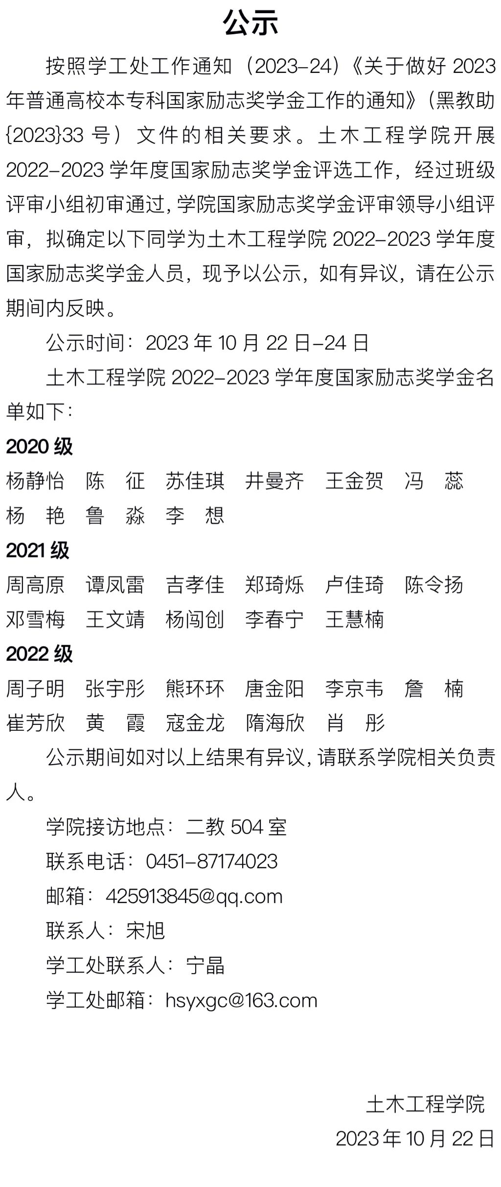 我院2022-2023学年度国家励志奖学金评选结果公示