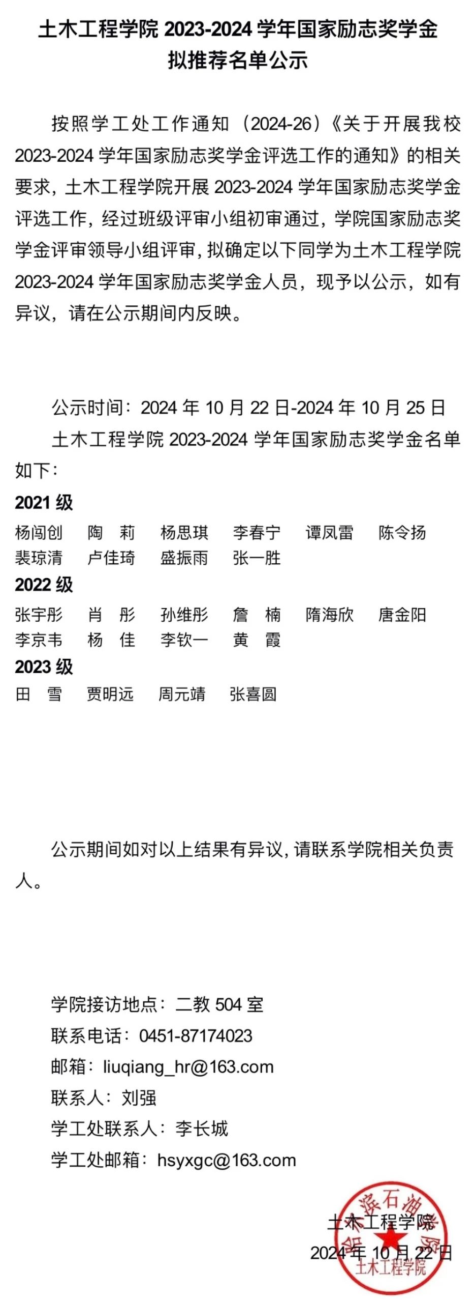 我院2023-2024学年国家励志奖学金拟推荐名单公示