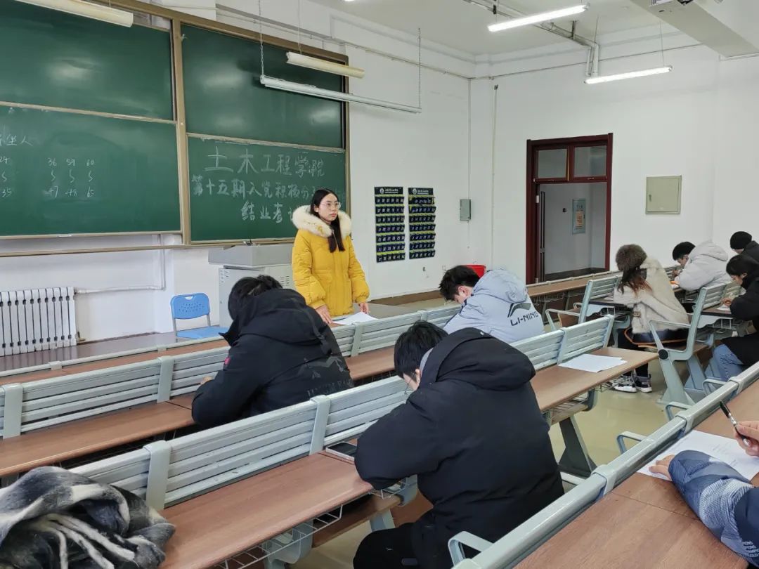为树立正确的入党意识,使我院入党积极分子了解中国共产党的性质、根本宗旨、指导思想等理论知识,端正入党动机,土木工程学院于12月21日,在主楼101、104教室开展2023年初级党课培训班结业考试 ,此次监考由学生党支部书记赵宇和王铁媛负责,全院积极分子参加考试。