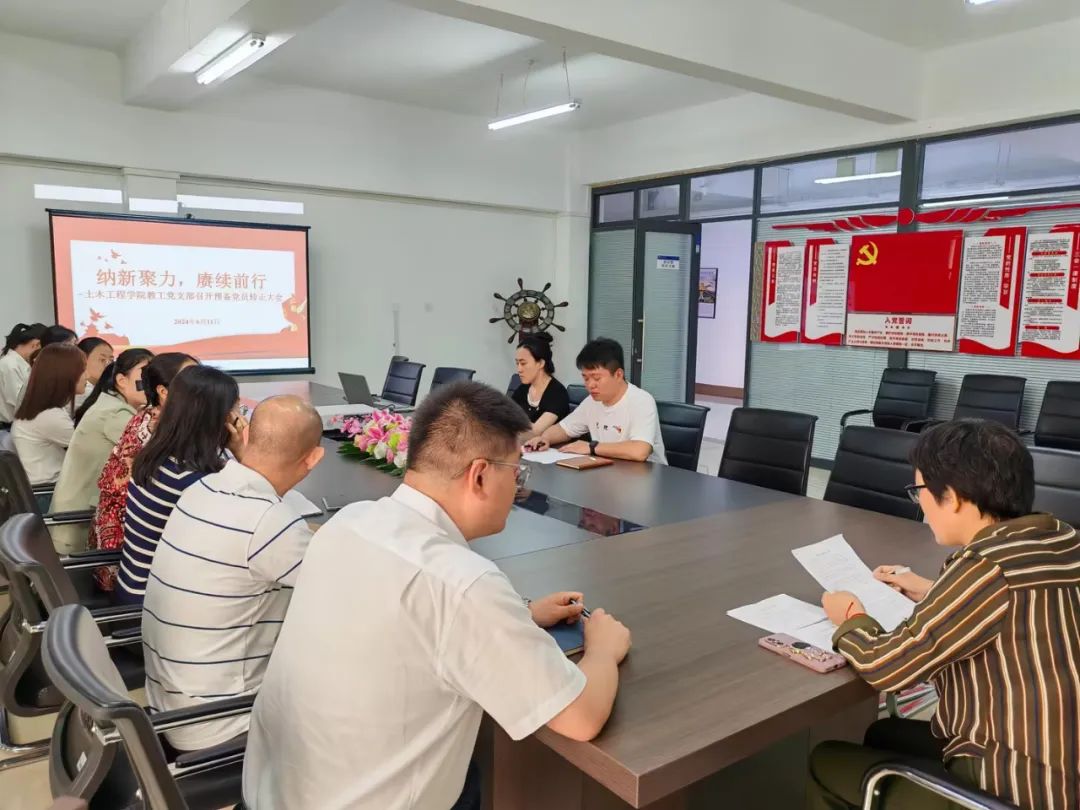 2024年6月11日下午,土木工程学院教工党支部在学院党员之家举行了关于孙强和王宇琦两位同志的预备党员转正大会。此次大会是对两位同志在预备党员期间表现的全面考核,也是对他们即将成为正式党员的重要仪式。本次会议由教工党支部书记崔艳主持,党总支书记宋旭及全体教工党员参加。