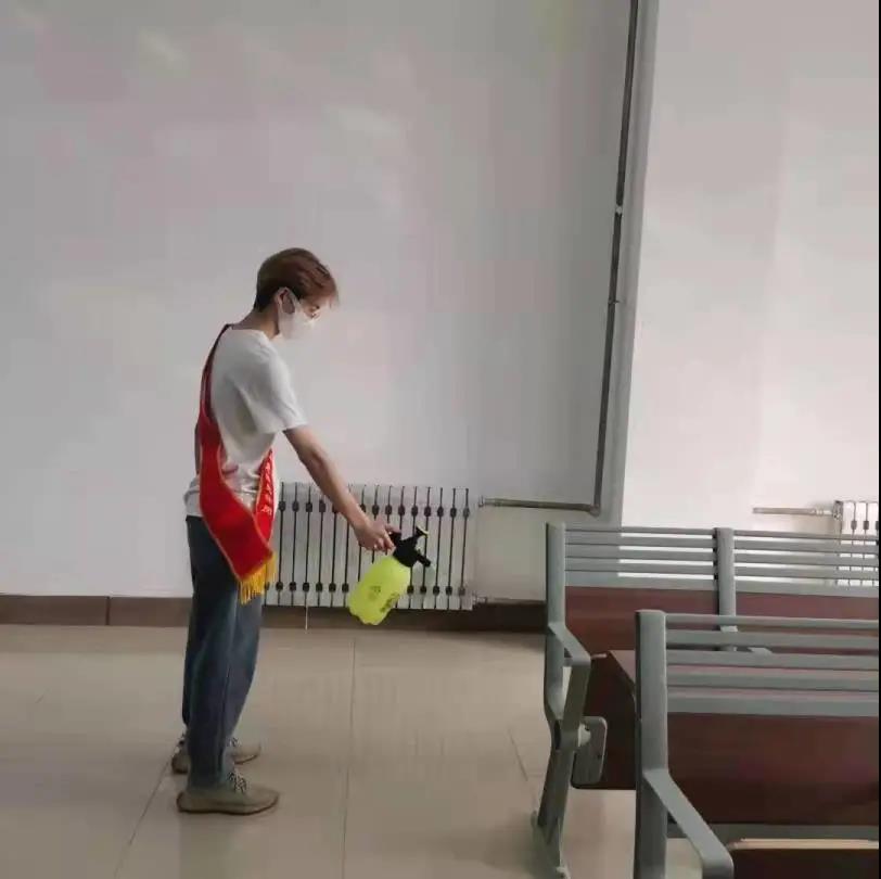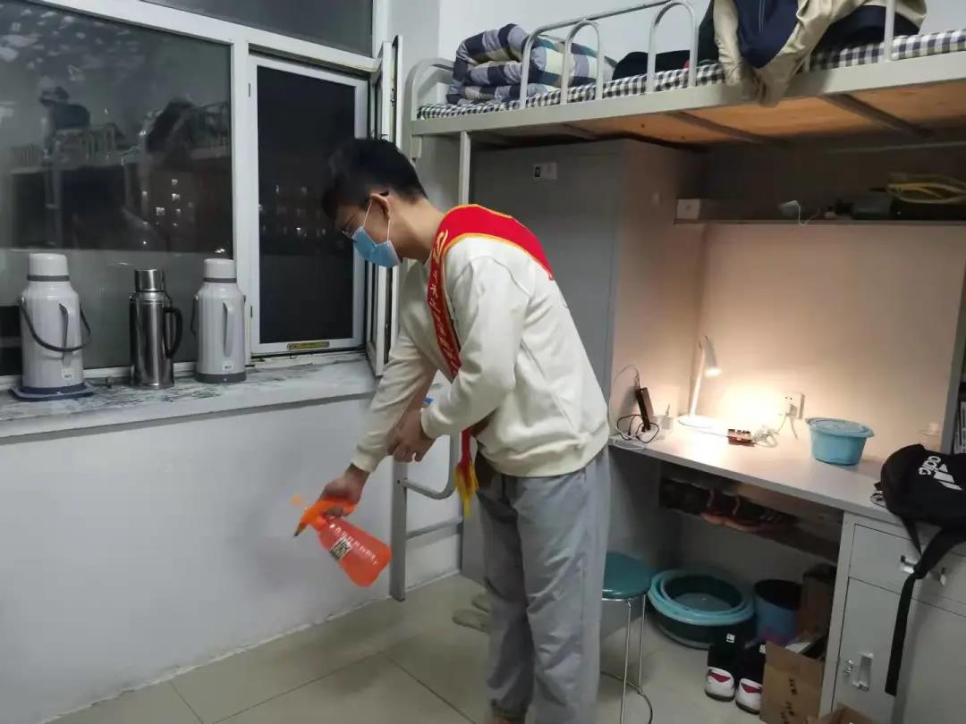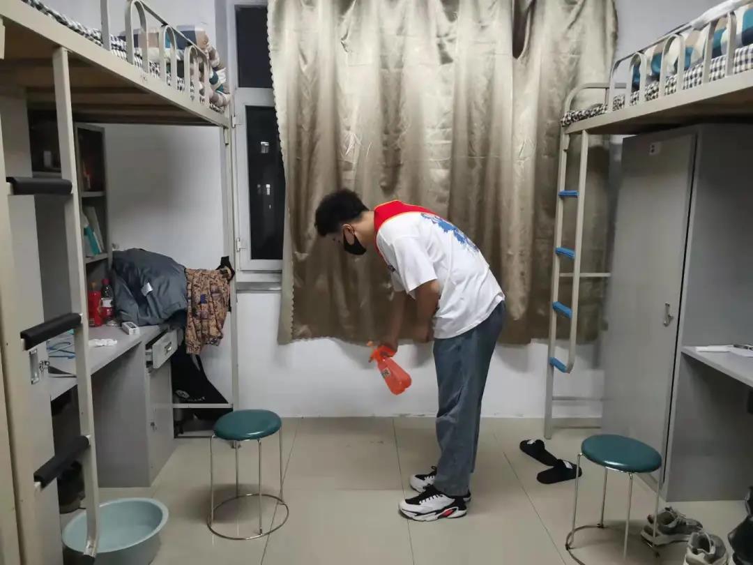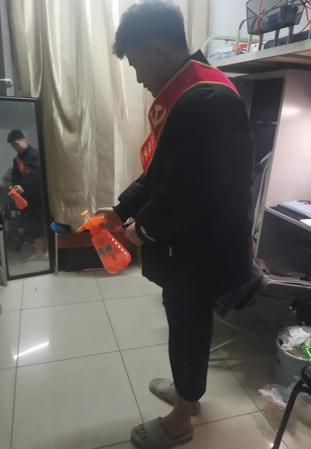 由几位学生党员牵头,佩戴红色绶带,首先进入学生公寓利用喷壶对每个寝室的地面角落等进行喷洒消毒,防止病菌滋生。紧接着,学生党员们到达教学楼,对教室地面进行清扫、杀菌,向同学们展示了在疫情期间如何正确有效的实现对自身的防护以及保持干净的环境。学生党员带头行动,希望同学们可以自觉遵守学校有关疫情防控工作的规定,树立正确的防疫观念,积极配合学校工作。