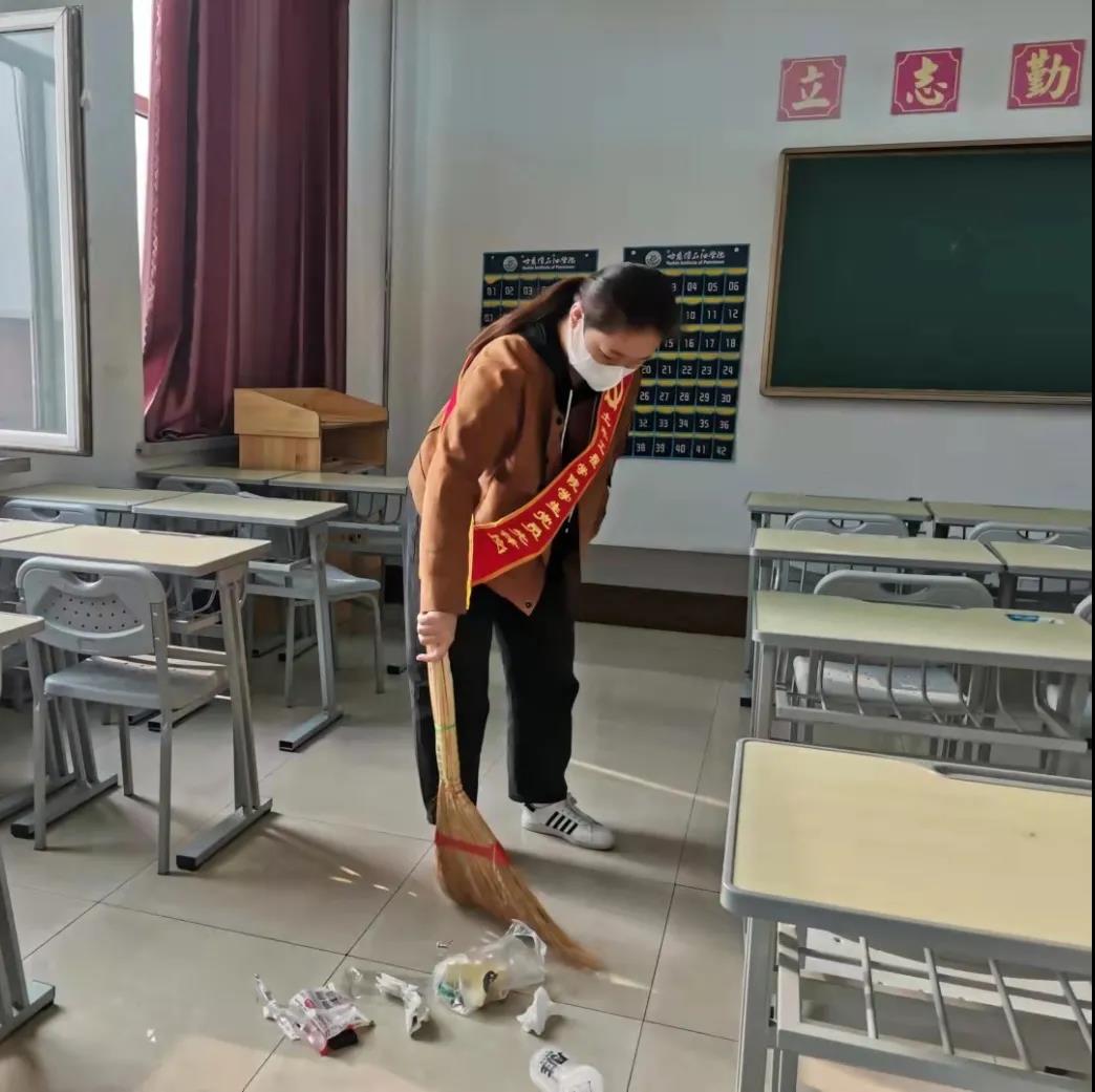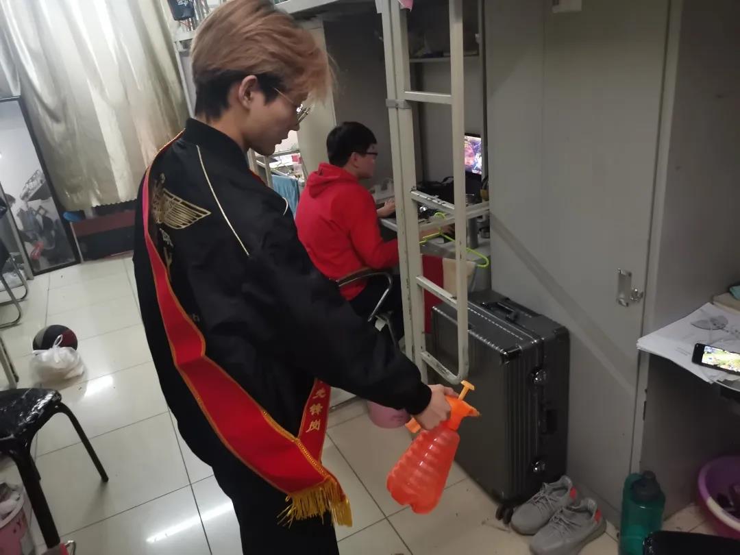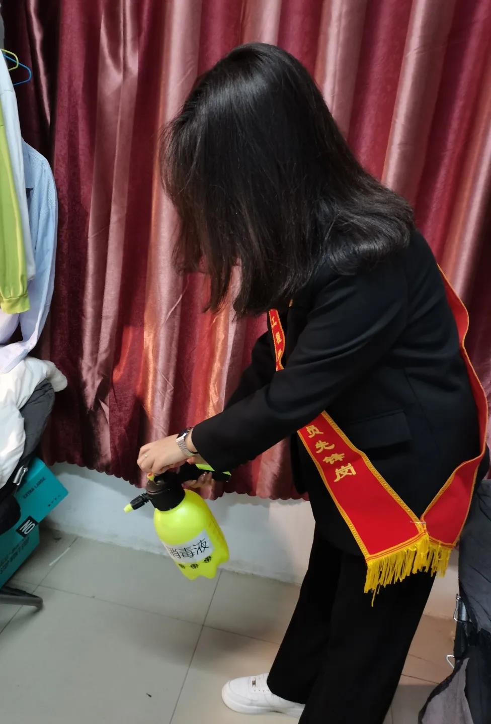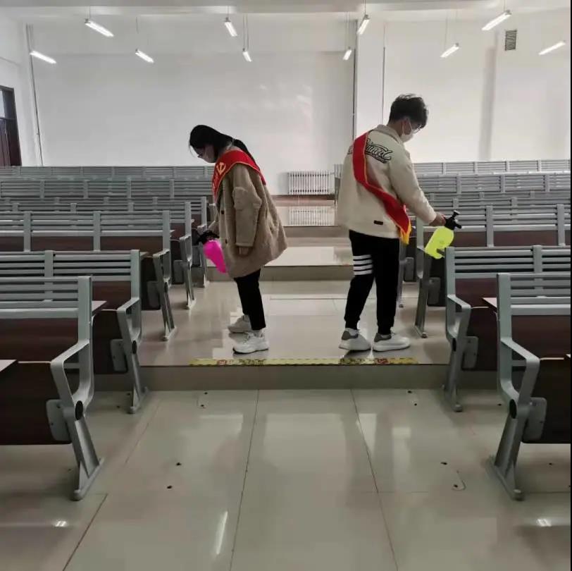 由几位学生党员牵头,佩戴红色绶带,首先进入学生公寓利用喷壶对每个寝室的地面角落等进行喷洒消毒,防止病菌滋生。紧接着,学生党员们到达教学楼,对教室地面进行清扫、杀菌,向同学们展示了在疫情期间如何正确有效的实现对自身的防护以及保持干净的环境。学生党员带头行动,希望同学们可以自觉遵守学校有关疫情防控工作的规定,树立正确的防疫观念,积极配合学校工作。