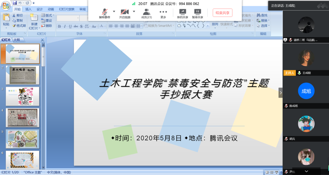 2020年5月8日下午17:00,土木工程学院社团联合会在腾讯会议上开展以“禁毒安全与防范”为主题的手抄报评选活动。会议由土木工程学院社团联合会主席孙泽蔓主持,邀请人员有校社团联合会的学生干事,参会人员有社团联合会书记王成程,以及各部门副部长和各社团副社长。