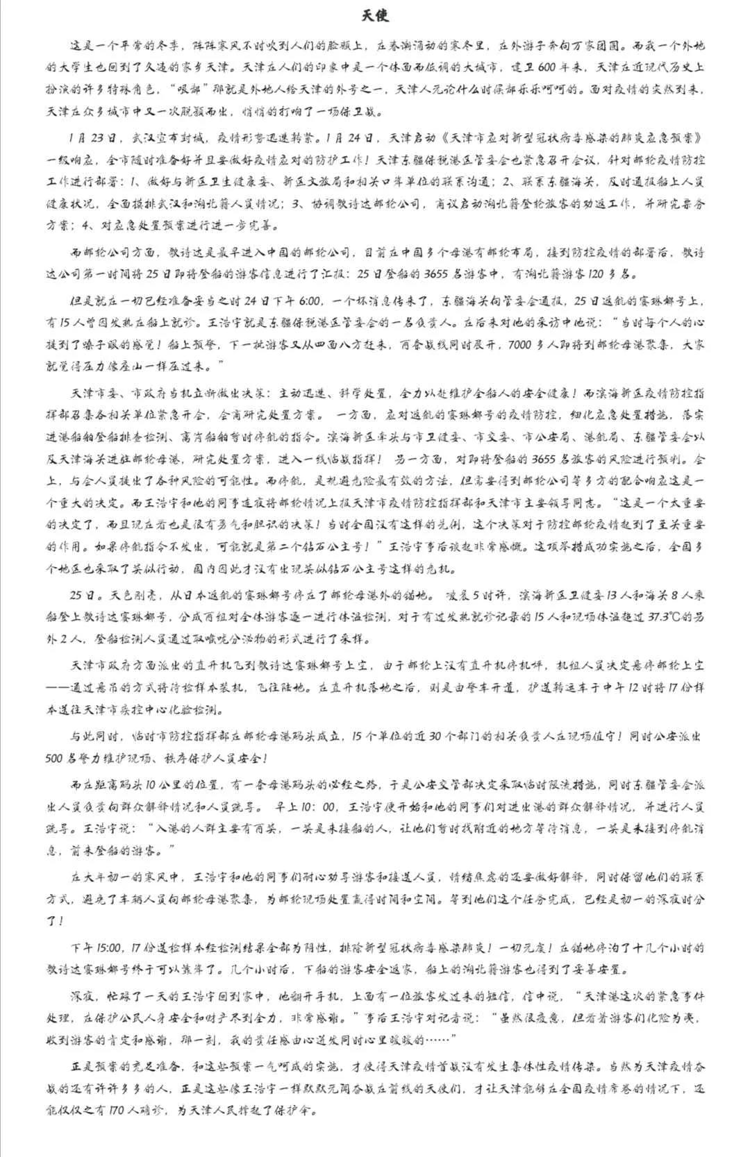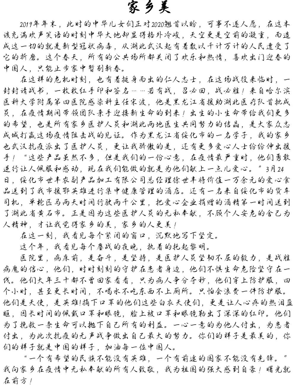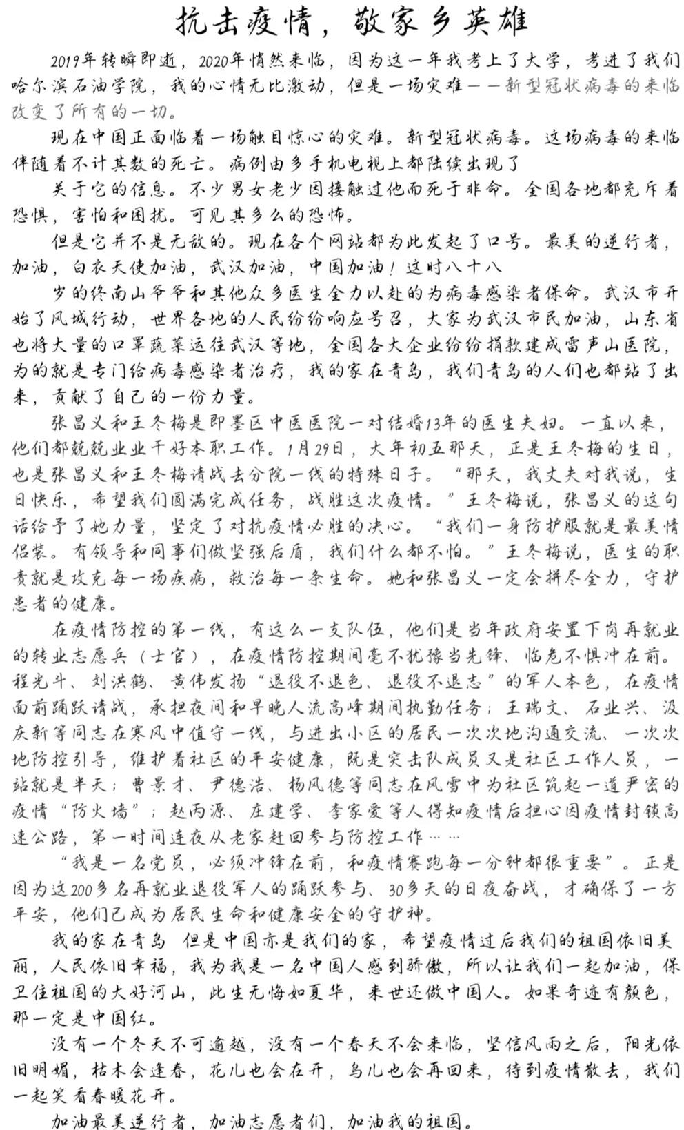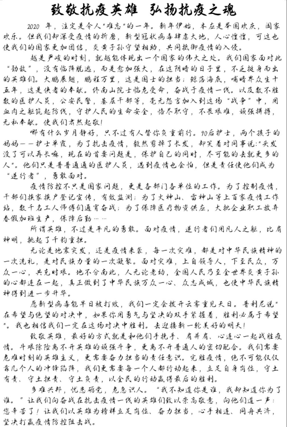为弘扬平凡人的不平凡事迹,弘扬平凡抗疫人甘于奉献、无畏付出的崇高精神,引领广大学子勇担新时代青年责任,培养有责任、敢担当、心怀天下、脚踏实地的新时代青年。我院组织了“致敬抗疫英雄,书写家乡之美”主题征文活动。活动中同学们积极踊跃参加,现将同学们的征文作品展示如下: