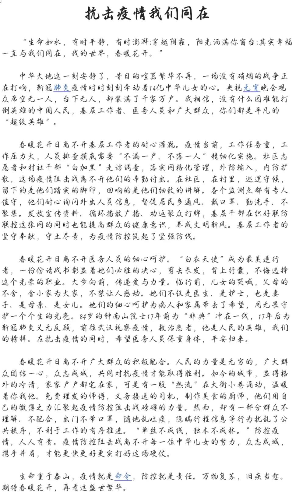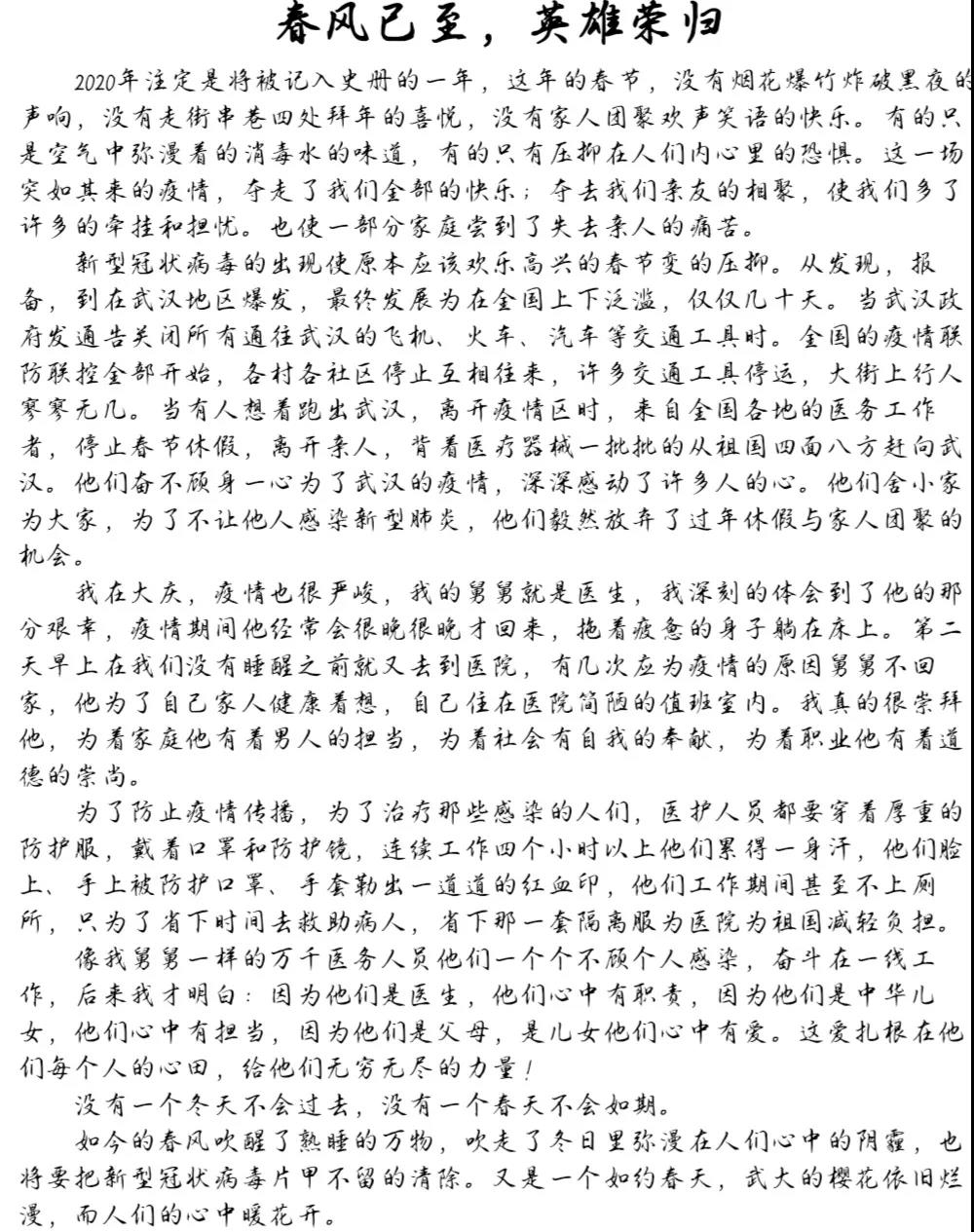 “一个有希望的民族不能没有英雄,一个有前途的国家不能没有先锋。总有那些逆向而行的英雄。”通过这次征文比赛,相信同学们在诵读平凡人不平凡事迹的过程中,深切体会到了新时代青年应有的责任担当,更从中坚定了自身的抗疫信心。疫情终将散去,让我们静待春暖花开!