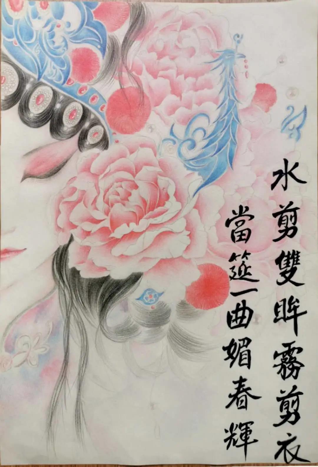 说到传统文化,我们可能就会不由自主的联想到在各种文化基础上所衍生出来的各种艺术:绘画、雕塑、书法、戏剧、节日等,在其中,各种艺术的结合也是并不少见的,这幅书签作品命名为“粉墨春秋”,名字的灵感是来源于中国传统舞剧《粉墨春秋》,借此题目,主要是表现了戏曲人对人生目标执着不懈的追求,从中弘扬民族文化,倡导民族美德,展示立志成才的风采,分享自强不息的精神,从而借此发扬我们的时代精神。这张书签作品主要是运用京剧花旦人物为主体,并以“大俗”牡丹元素加以修饰,其中“大俗”牡丹也与京剧中所谓的“京剧百花园中的牡丹”相合映衬,从中也衬托出了京剧时而淡雅、时而洗尽铅华、时而雍容华贵的特性。也正如宋代诗人葛长庚所言:“看千秋戏剧,蹴鞠诙谐。”京剧,这一中华民族孕育而出的国粹,恰似一朵绽放在华夏大地上的玉簪花,以它那独特的美,惊艳世人。