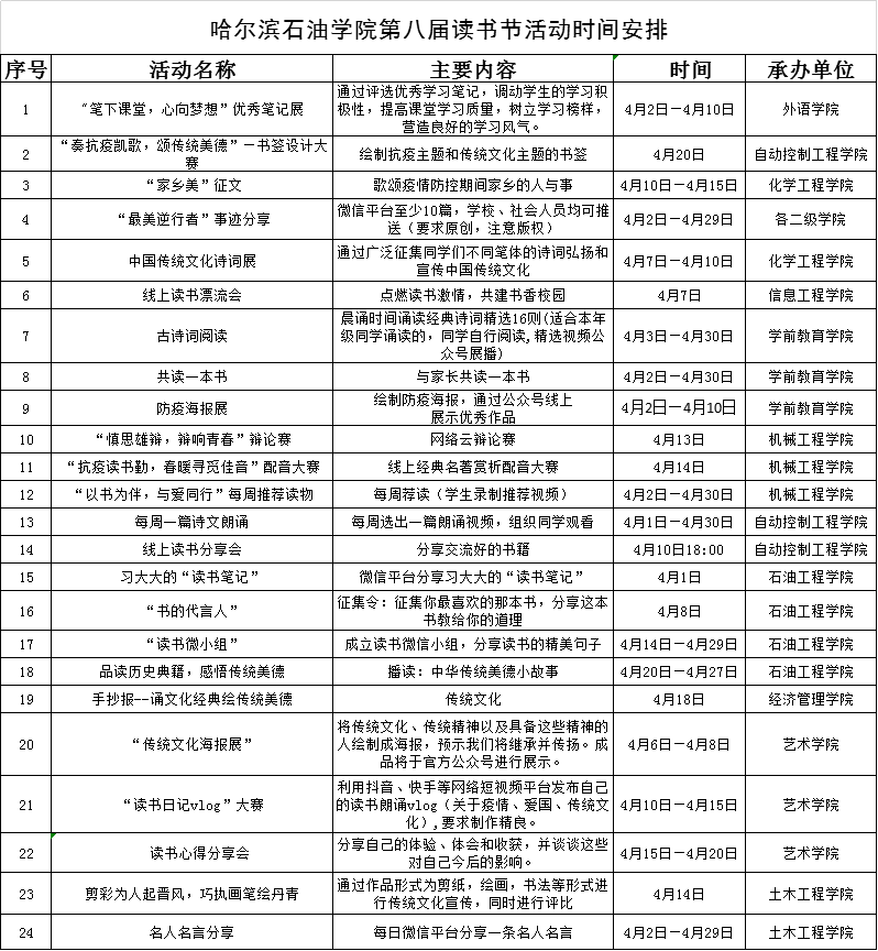 3 、4月28日前上交各学院读书节活动整体材料汇编(电子版)。内容包括:各项活动的计划、总结、1M以上的高清照片,上交至班级负责人。