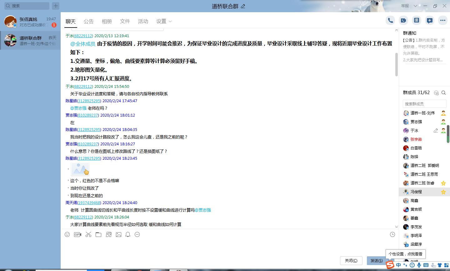 土木工程专业(道桥方向):在疫情期间为保证毕业设计整体质量,道桥方向毕业设计指导教师充分利用电话、网络等多种方式进行远程指导,采取线上教学,保证每周不少于1次,通过钉钉直播的形式集中指导,同时借助QQ、微信督促学生进行自主学习并对同学们提出的问题进行耐心地解答。定期开展毕业设计进展和质量情况摸底、监控工作,加强过程管理,确保毕业设计质量不降低。道桥的毕业设计是某路段的两阶段初步设计,目前已完成纸上定线、平面设计、纵断面设计。