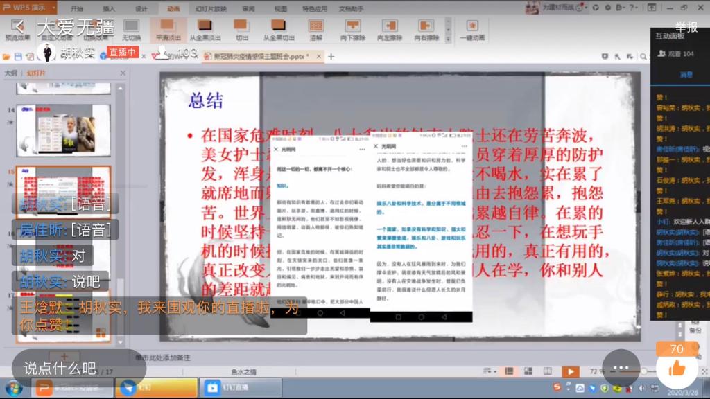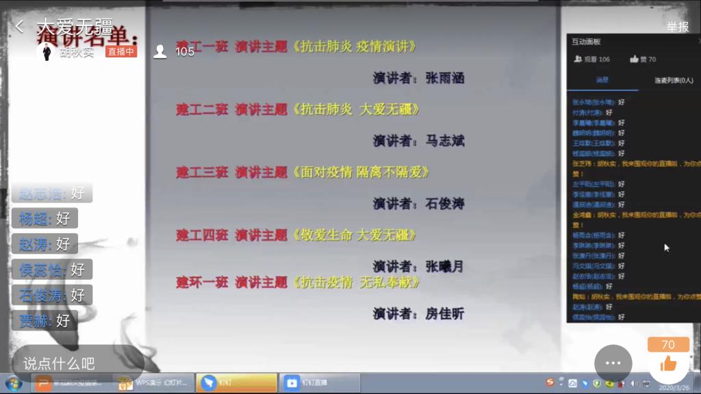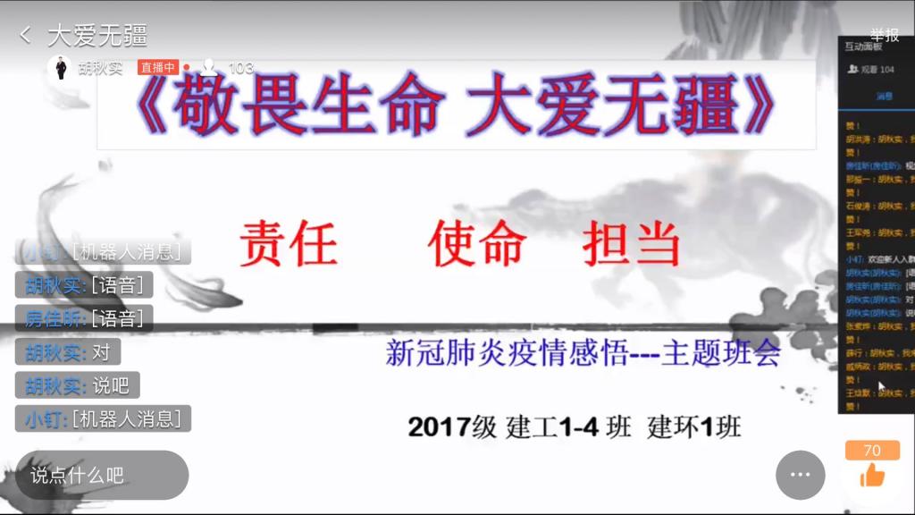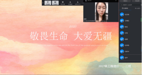 3月23日以来,土木工程学院各年级陆续开展了以“敬畏生命•大爱无疆”为主题的班会,通过网络班会交流沟通,使学生懂得敬畏自然和生命,感恩一线“战疫将士”的付出,培养学生的爱国主义精神。