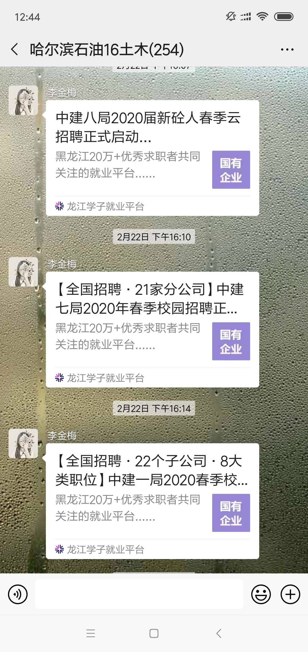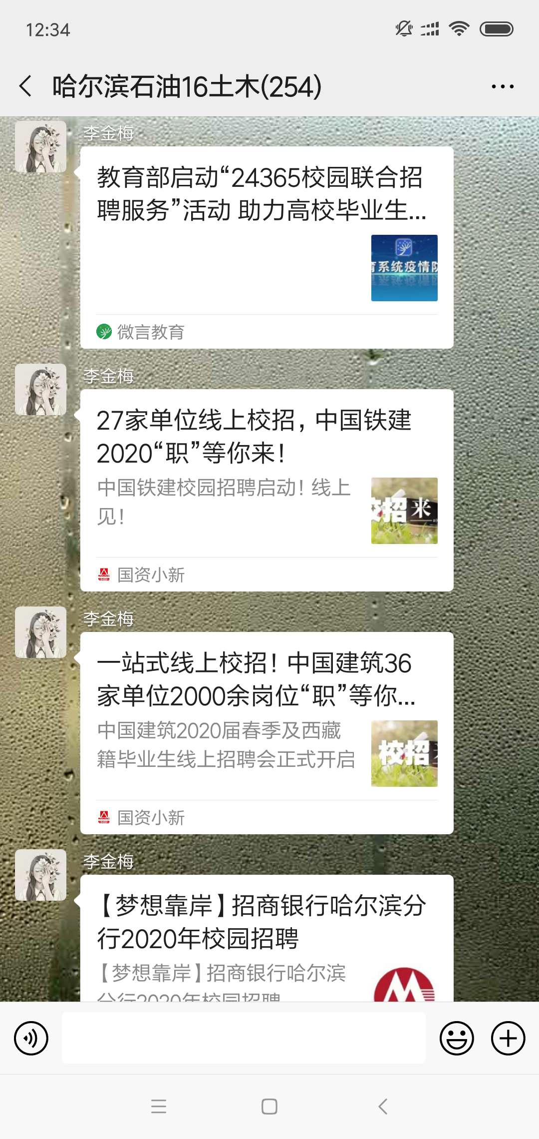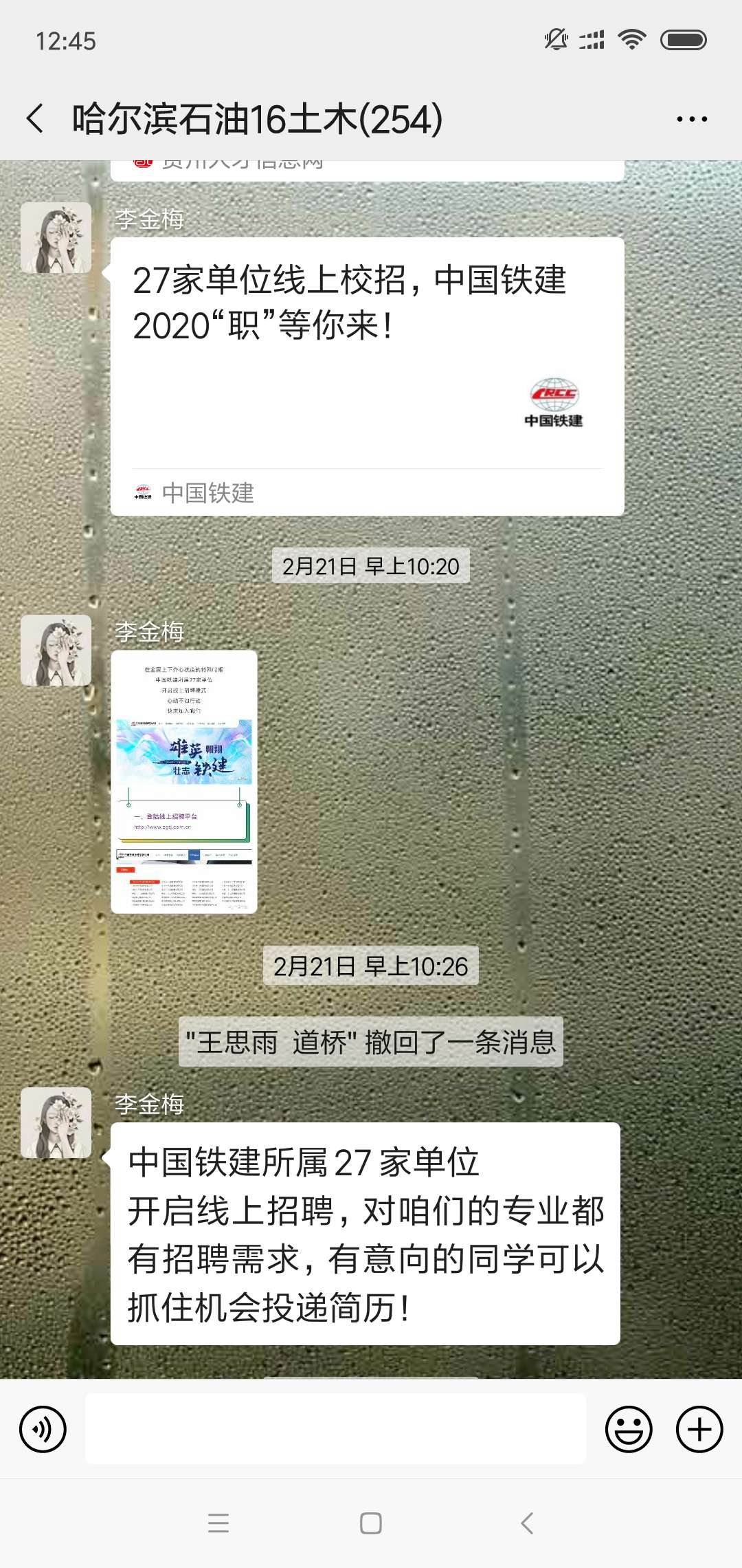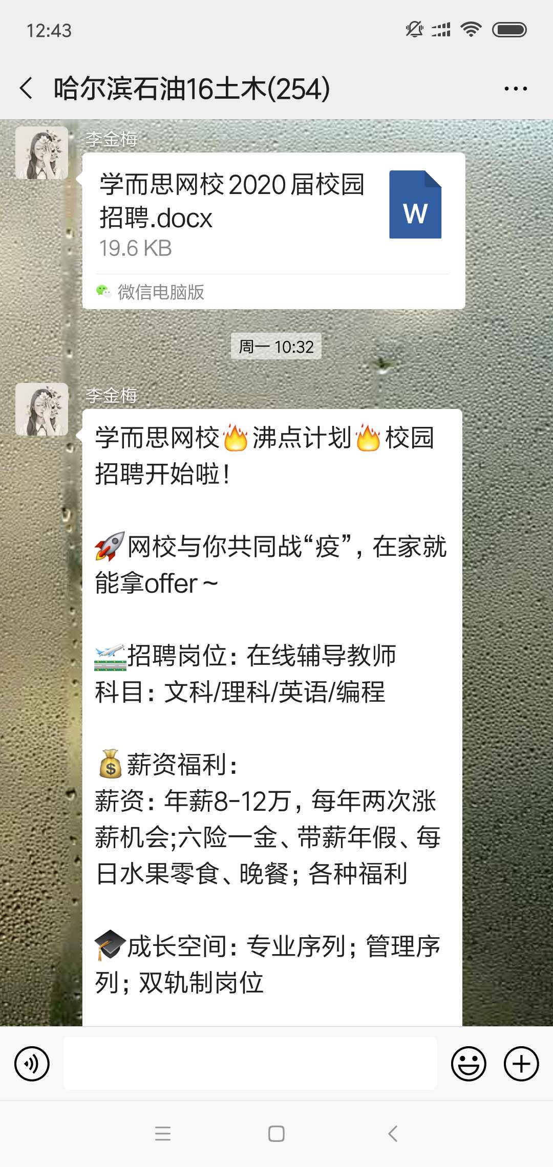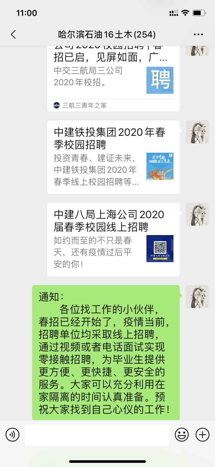 面对大四毕业年级急于找工作的同学们,辅导员通过网络将用人单位和招聘岗位信息及时发布给同学们,鼓励大家通过网络应聘、网络面试的形式为自己寻求到理想的工作岗位。