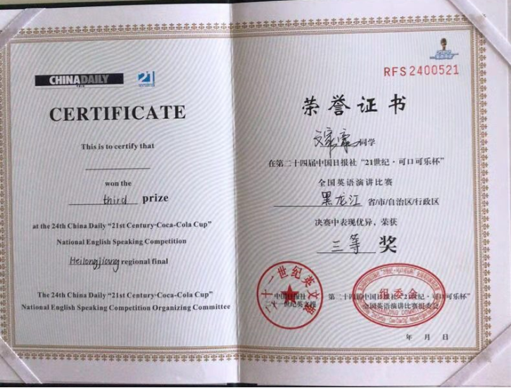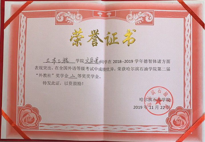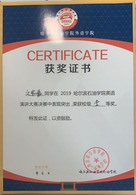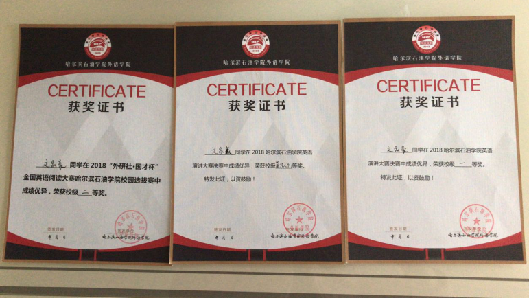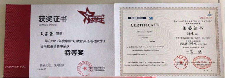 文家豪同学积极参加学校组织的各项活动,尤其是在英语比赛方面,大一一年他收获颇丰,大一上学期分别荣获了外研社演讲比赛一等奖,二十一世纪可口可乐杯校选赛一等奖、黑龙江省三等奖,阅读大赛校级二等奖;在大一下学期,分别荣获了外研社全国大学生英语辩论赛三等奖,全国大学生英语竞赛三等奖,黑龙江省好学生英语赛事活动特等奖,学校单词大赛一等奖;到现在的大二上学期,他又荣获了外研社阅读大赛黑龙江省三等奖和外研社演讲校级一等奖,并获得了伟德官网本届外教社二等奖学金。文家豪同学还经常利用自己的空闲时间给其他同学传授学习心得和学习方法,并且多次带领同学参加比赛,目前他正在为组织一支英制辩论赛队伍做准备。