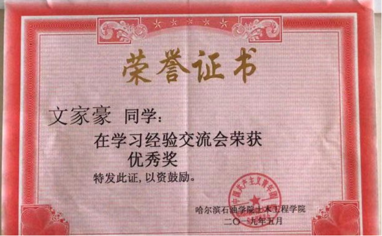 在进入大学后文家豪同学就给自己设定了明确的目标,打算去一所理想的大学读研深造,因此,他认真学习,在每一科课程上都严格要求自己,争取取得好的成绩,经过他的不懈努力,大一上学期专业排名第一,大一下学期专业排名第二,并获得了2018-2019学年度校级二等奖学金和“三好学生”荣誉称号。