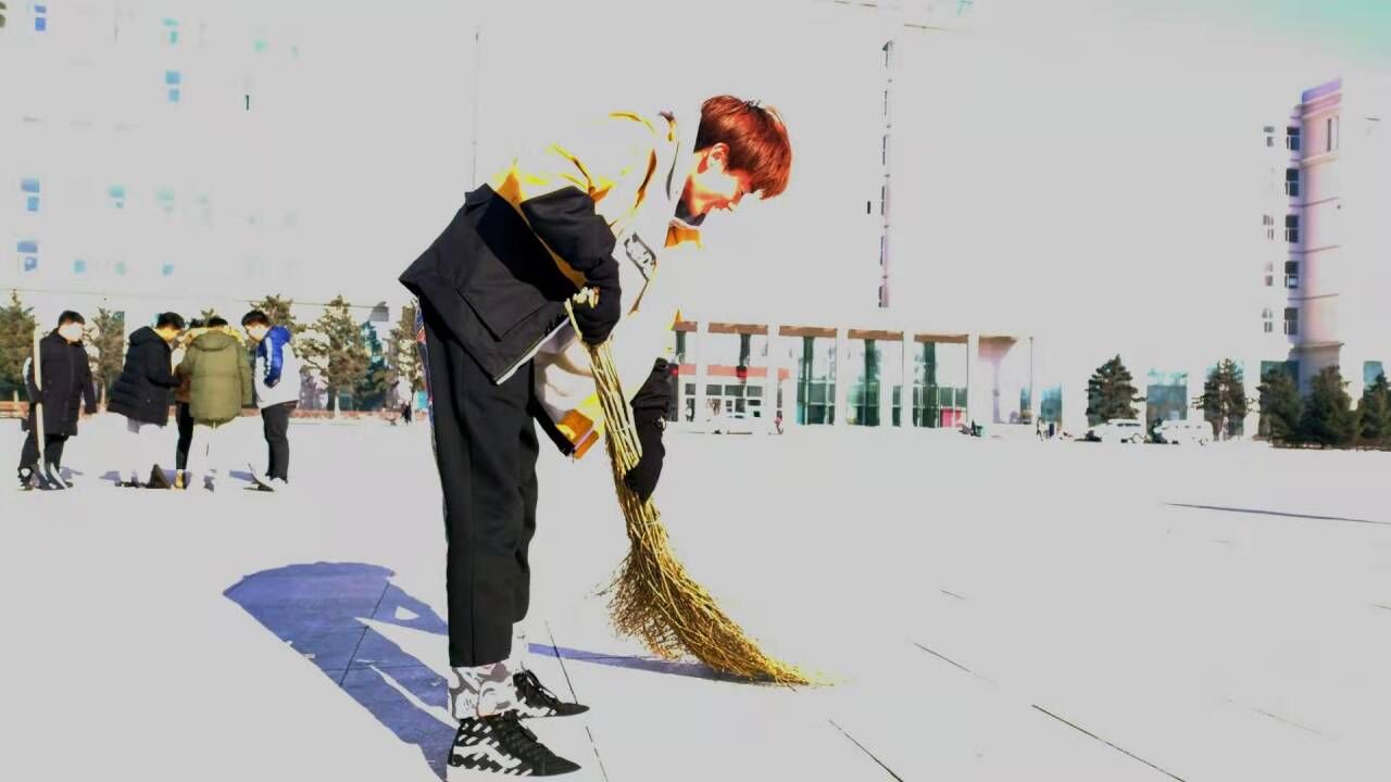 零下16度的寒冷却遮盖不住同学们扫雪的热情,辅导员在现场即当指挥者又当劳动者,同学们见了也都纷纷“撸起袖子加油干”丝毫不惧严寒天气带来的影响,叮叮当当的碰撞声中一块又一块的积雪被消除,黝黑的柏油路再次显露出来,笑脸也在同学们的脸上渐渐浮现。铲冰除雪热情高亢,团结合作背影最美,路过的同学也都停下脚步,为这支扫雪大军竖起拇指。