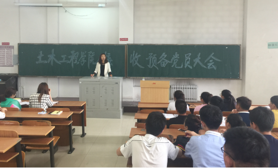 2016年6月12日中午12点,主教404教室,土木工程学院学生党支部召开接受预备党员大会。大会的主要议题是讨论本支部9位同志入党问题。党总支书记孙金莹、全体辅导员、学生支部全体党员和部分入党积极分子参加了会议。会议由学生支部书记赵宇主持召开。本次会议严格按照会序进行:宣读入党志愿书、介绍人介绍学生现实表现、与会党员讨论、到会的正式党员投票表决、支部书记宣读支部大会决议、发展对象表明自己的态度。大会在庄严的气氛下完成,被接收为预备党员的9名同学也非常激动,表示要全心全意为同学们服务,争取做一名合格的共产党员。随后,每名学生党员发放了《党章》、党徽和学习笔记。