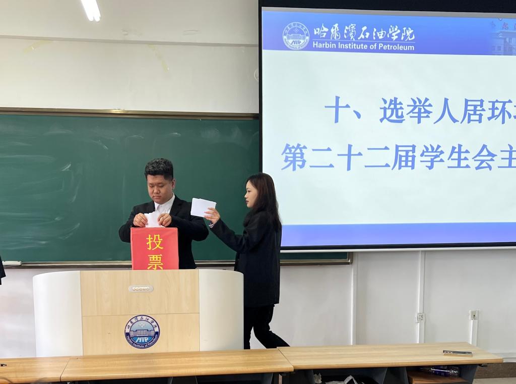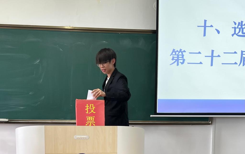 大会第七项:学生代表艾嘉龙、卜彦嘉对投票箱进行检查。所有参会成员进行投票选举。