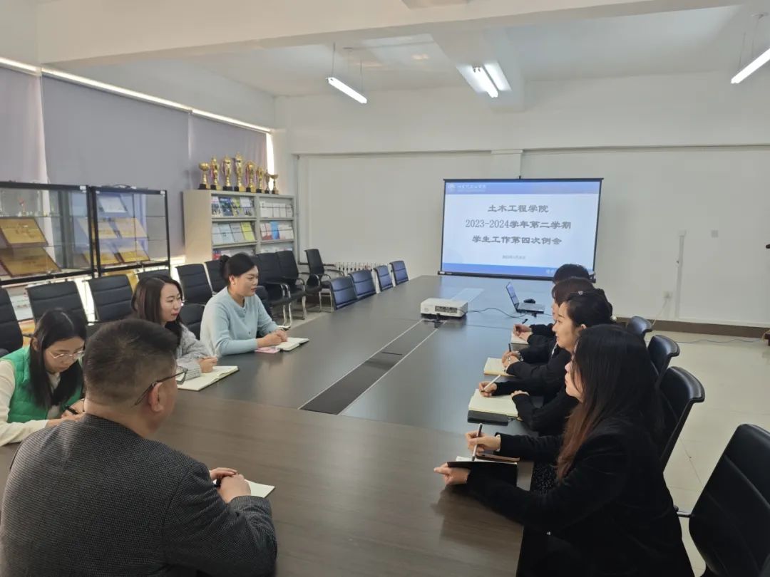 3月27日上午,土木工程学院在学院会议室召开2023-2024学年第二学期第四次学生工作例会。本次会议由学院党总支书记宋旭主持,全体辅导员参加会议。