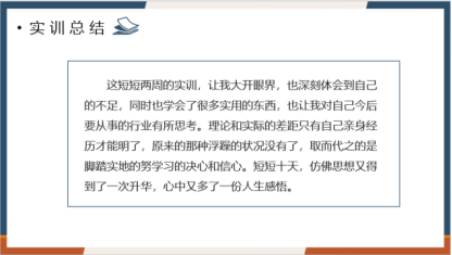 通过本次实训,检验了学生的综合素质和实践能力,加深了同学们对实践学习的认知。整个实训环节总体效果良好,同学之间相互配合、分工协作,提高了动手能力、数据分析处理能力、团队协作能力,为今后从事专业技术工作提供必要的基础理论和技能训练。