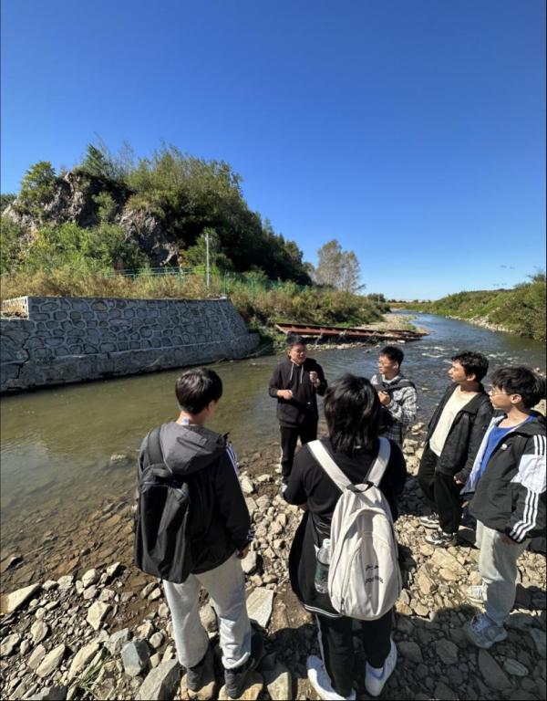 实习第二天,组织学生前往阿城区玉泉镇实习基地,进行了小黑子河河谷地质刨面图的测量以及对小孤山山顶裸露基岩观察及测量。
