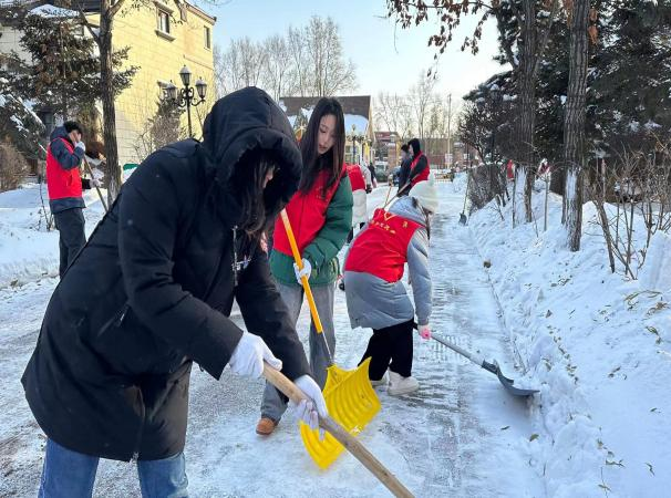 活动中,志愿者们干劲十足,不畏严寒,积极投身到扫雪队伍中,大家挥舞铁锹和雪铲对周边的积雪进行清扫,齐心协力、配合默契,忙碌的身影在皑皑白雪中构成了一道特殊的风景线。虽然室外温度很低,大家的脸都被冻的通红,却丝毫没有影响清除积雪的热情。因为大家知道一条整洁、通畅的道路带给大家的不仅是方便和安全,更是传递一份温暖和正能量。