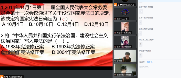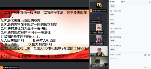 为全面贯彻落实习近平新时代法治教育思想,弘扬宪法精神,提升青年学生法治意识和爱国情操。土木工程学院于2023年7月20日在线上举办以“弘扬宪法精神,树牢法治理念”为主题的宪法知识竞赛,各年级学生代表参加。