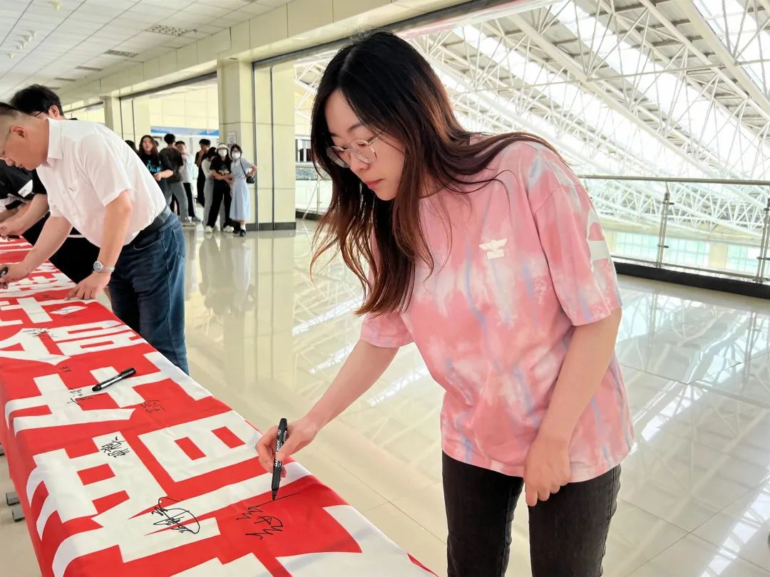 为更好地引导同学们正确认识艾滋病、毒品的危害,增强师生“远离毒品、预防艾滋”的意识,创设文明健康育人环境,营造良好的校园氛围。土木工程学院于6月7日中午在第一教学楼四楼开展“禁毒防艾”承诺签名活动。学院党总支书记宋旭、全体辅导员老师,以及各年级学生代表参加此次活动。