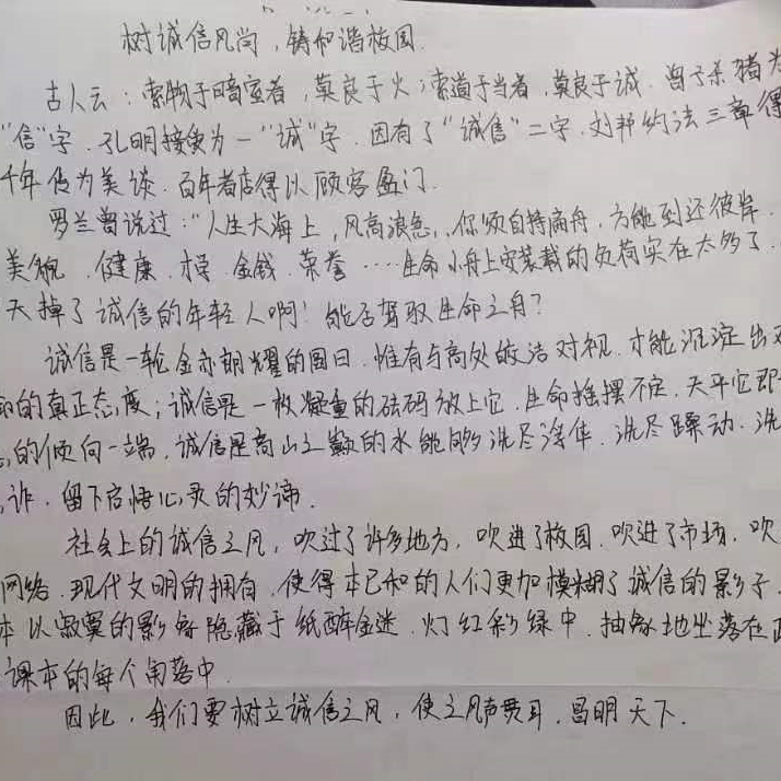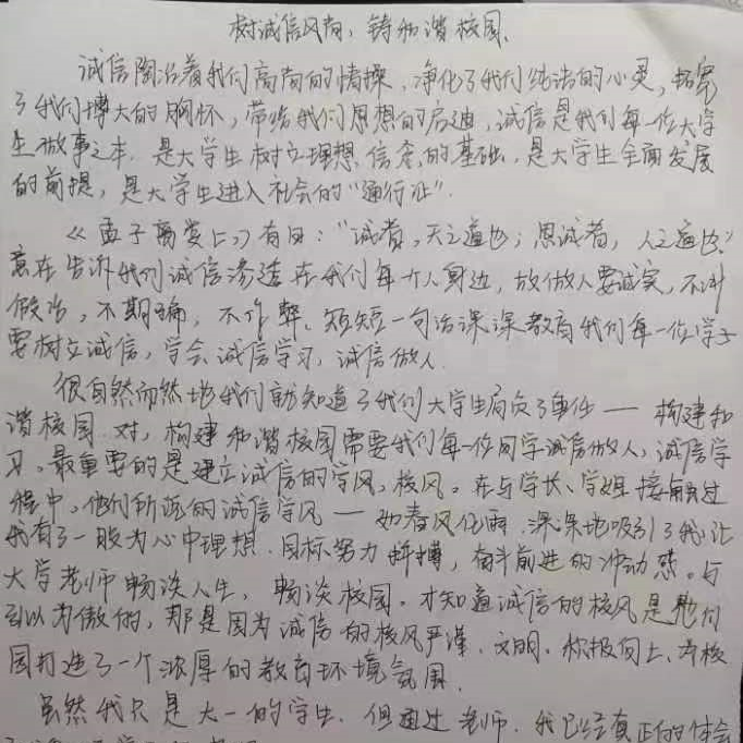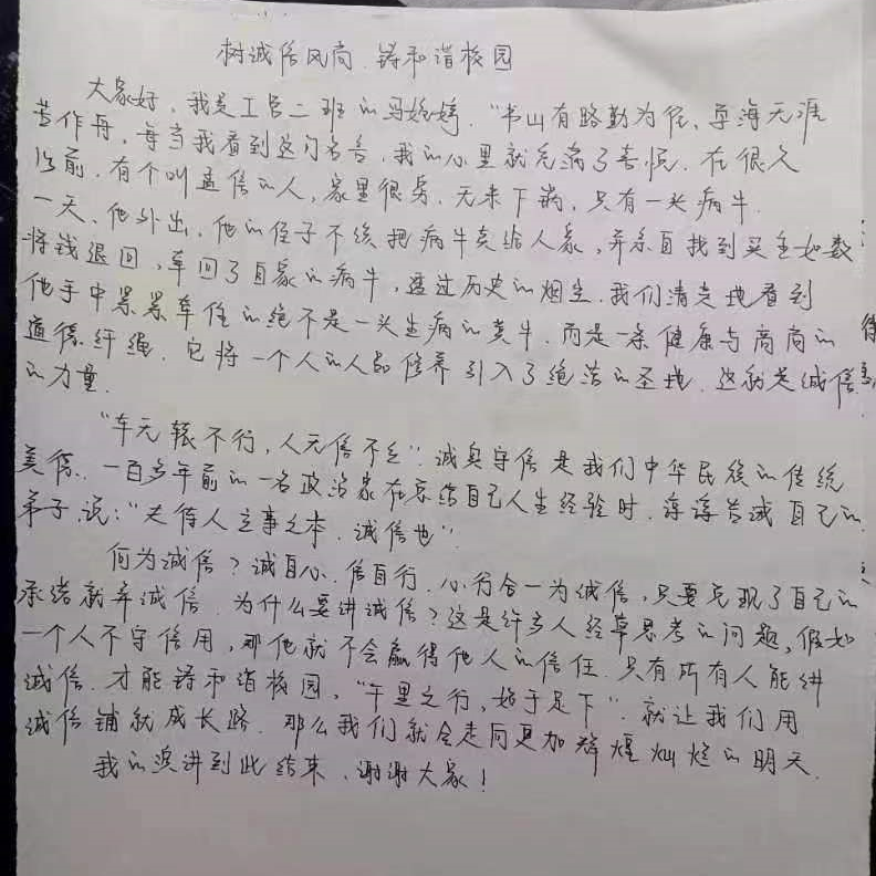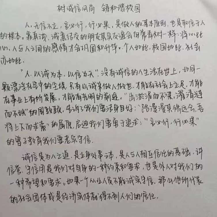 《孟子离娄上》有曰:“诚者,天道也;思诚者,人之道也。”诚信是每一个人做事之本,是学生树立理想信念的基础,是学生全面发展的前提,是学生进入社会的“通行证”,同学们在此次活动中积极参与,积极分享自己的诚信小故事,形成了良好的诚信氛围。土木学子始终坚持树立诚信品质,传承优良校风,自觉将诚信融入到个人的世界观、人生观、价值观,不断丰富自己,立德以诚,筑牢爱国之基。