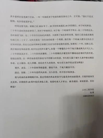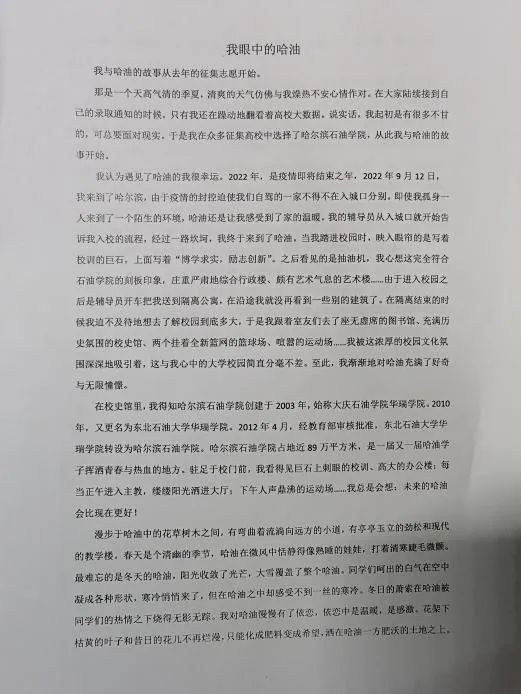 本次活动得到了全院学生的积极响应和踊跃参与,同学们紧扣主题从不同角度表达情谊,生动质朴地刻画,以及饱含感情的记忆,千言万语表达了他们对哈油的感情,作品内容涉及哈油印象、哈油故事、学校的历史变迁、寄语母校等。
