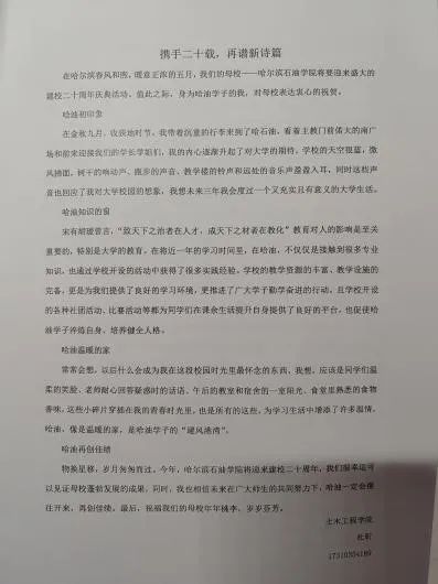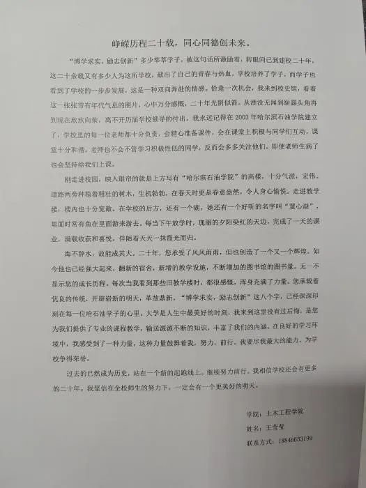 二十年的求索进取,二十年的桃李芳华。在学校二十年校庆之际,为增强学校凝聚力,引导学生在喜迎校庆的浓烈氛围中抒发对哈油至深情怀,让学生表达最真挚的祝贺。我院于2023年4月6日-4月14日举行“我的哈油”为主题的征文活动。