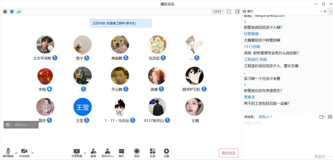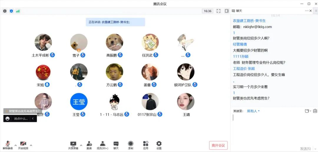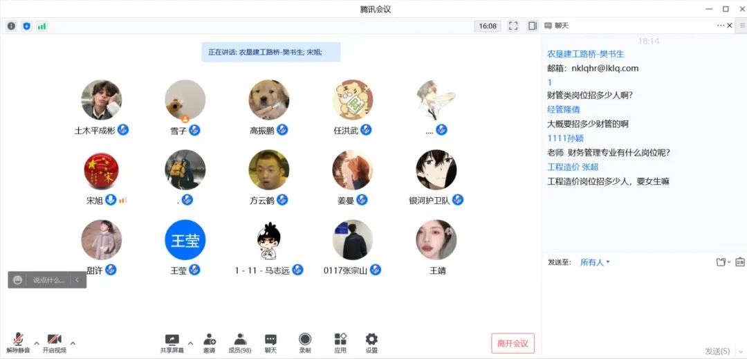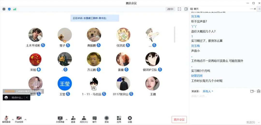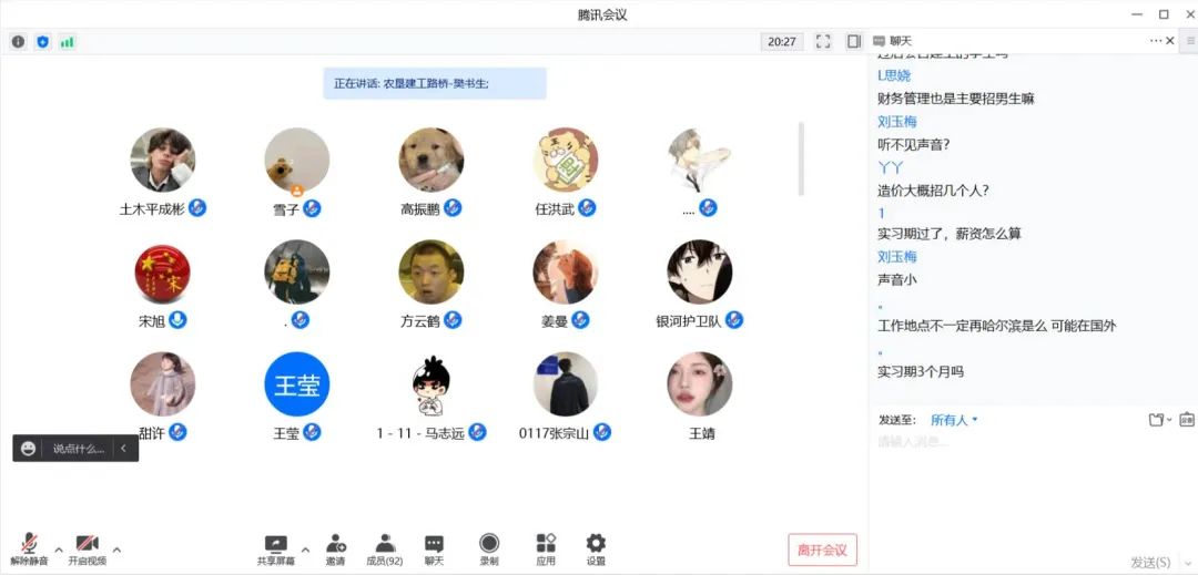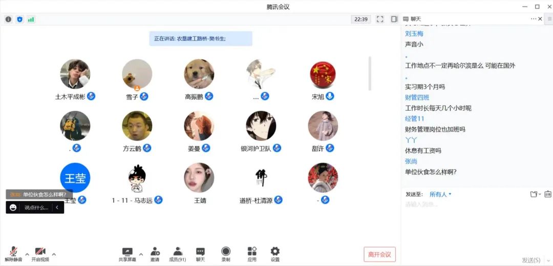 首先,黑龙江农垦建工路桥有限公司人力资源部樊书生老师向同学们介绍了企业背景以及公司文化。他结合时代背景及专业发展方向,进一步增强了同学对企业的了解。在双向选择的前提下,学生在企业实习工作,可以有效提升专业技术和职业技能。最后,樊老师为同学安排了线上答疑的环节,与同学就企业实习的具体问题进行详细交流沟通。