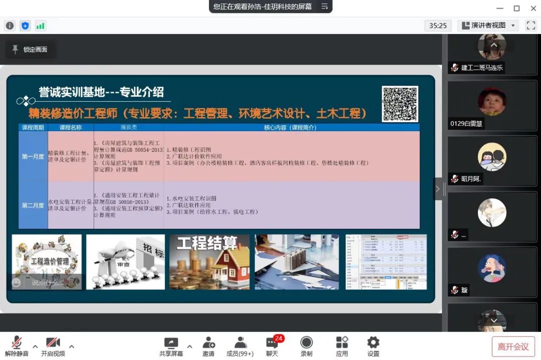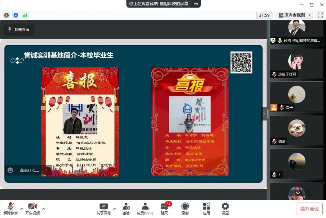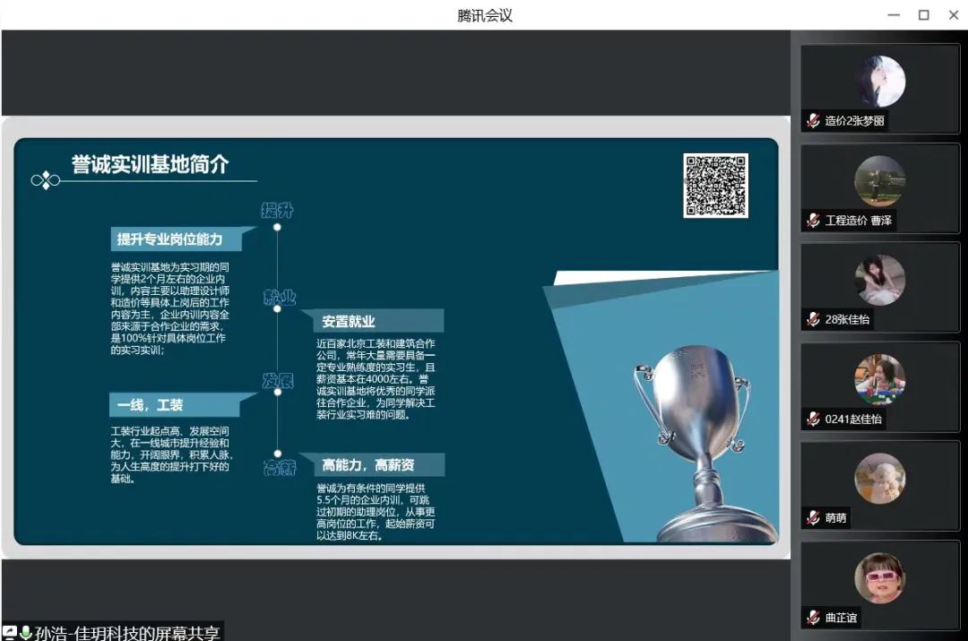 企业的孙浩经理向同学们介绍了公司发展状况、企业文化、工作岗位等情况。通过PPT展示了企业所承建的各个重大项目工程。随后,孙经理介绍了实习学生薪资待遇和专业技能培训待遇,使同学们对北京佳玥科技有限责任公司有了更加详细的了解。企业招聘人员表示非常欢迎土木学子能够去往北京实现自己的梦想。宣讲结束后,与会同学就自己感兴趣的问题与企业进行线上交流沟通并表达自己的求职意向。