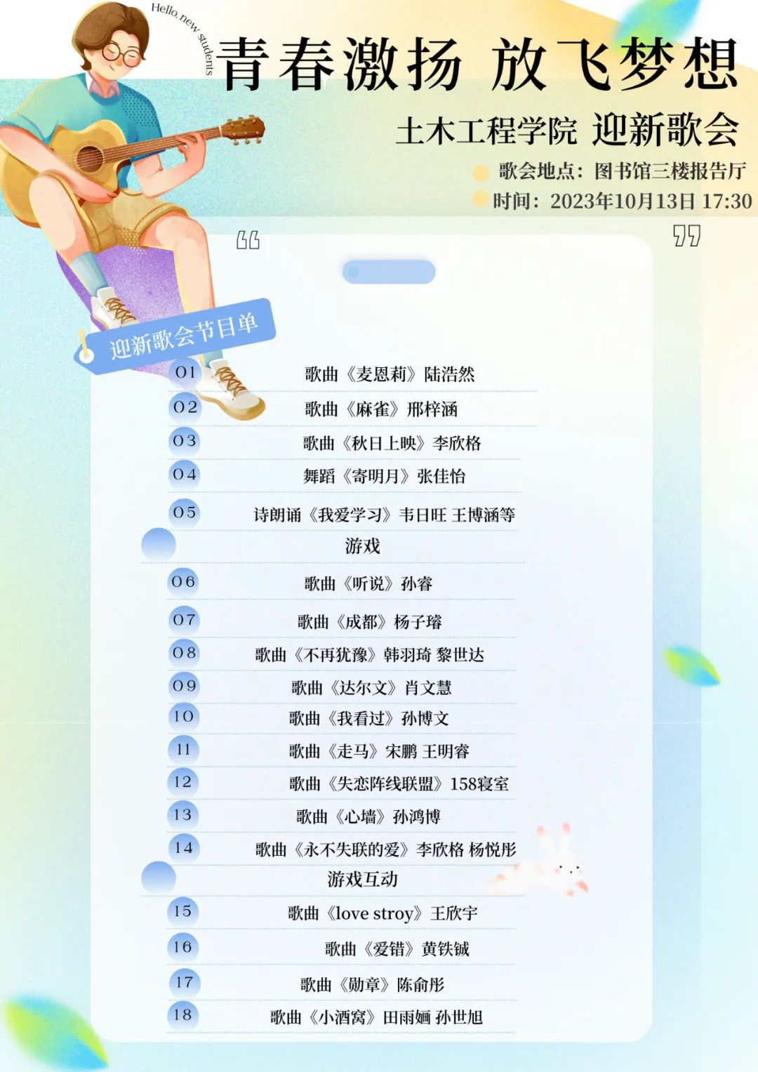 为了展现出学生们最热情活泼的一面,也为了让大学生活掀开一片崭新的篇章。2023年10月13日,土木工程学院在图书馆报告厅举办“青春激扬,放飞梦想”迎新歌会,土木工程学院团总支书记赵宇、2023级辅导员管艺濛及2023级全体同学参加。