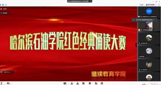 按照《教育部等九部门关于开展第24届全国推广普通话宣传周活动的通知》(教语用函【2021】1号)有关要求,和黑龙江省《省教育厅等部门关于印发第24届全国推广普通话宣传周活动方案的通知》(黑教联【2021】41号)文件精神,以习近平新时代中国特色社会主义思想为指导,结合疫情防控实际情况,继续教育学院于11月30日开展线上红色经典诵读大赛活动。继续教育学院院长出席活动,比赛评委由各二级学院党总支副书记或团总支书记以及继续教育学院老师担任,参赛选手为各二级学院自行选派的一只优秀学生队伍组成。