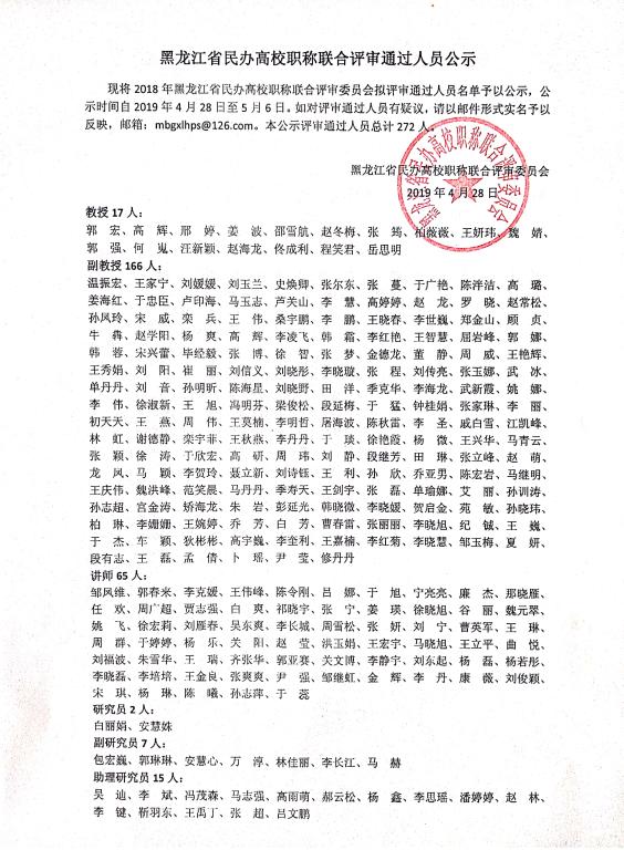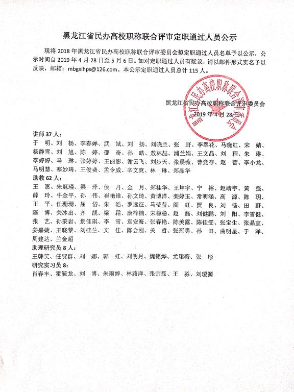 经民办高校职称联合评审委员会专家评审,2018年民办高校职称评定工作已经结束。根据有关规定,现对评审通过人员进行公示,公示期共7个工作日(即2019年4月29日至2019年5月5日)。凡对职称评定结果有异议者,请及时以书面形式并署名向学校职称工作领导小组办公室提出,联系邮箱120603472@qq.com。