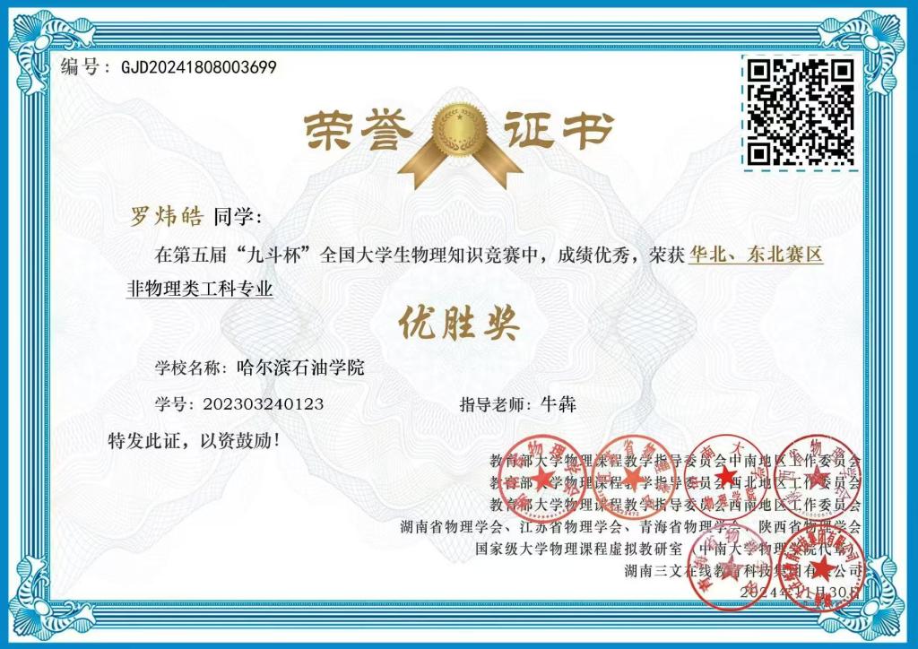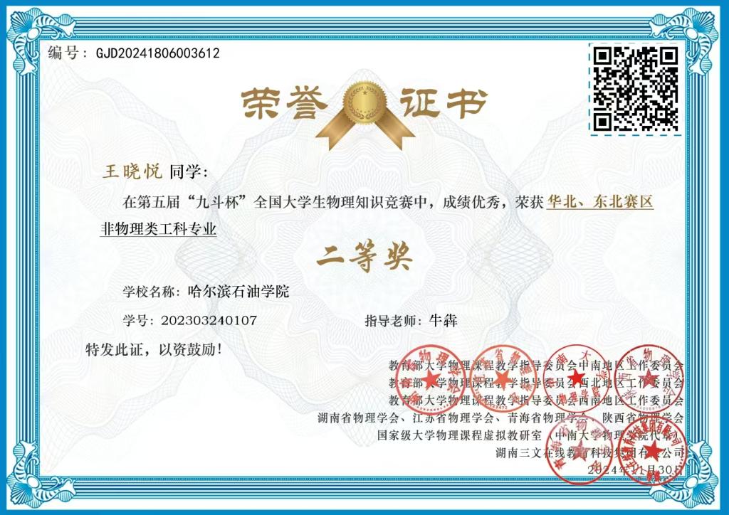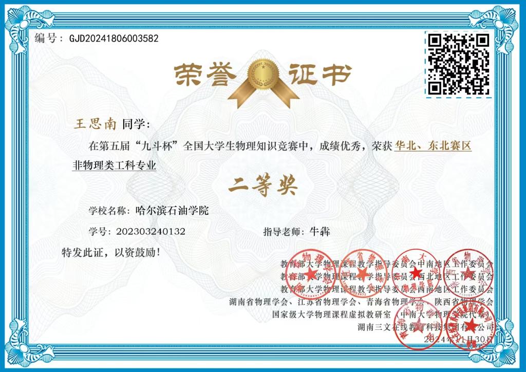 2024年12月16日,第五届“九斗杯”全国大学生物理知识竞赛决赛成绩公布并发放证书。伟德官网学生首次参赛,经过初赛、复赛两个阶段,荣获“华北、东北赛区”一等奖2项、二等奖4项和三等奖2项,其中2位同学晋级全国决赛。