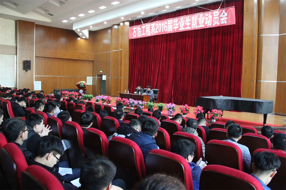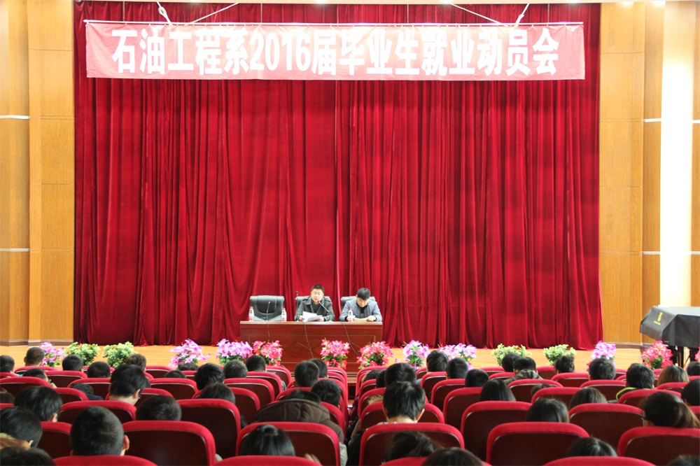 毛雷书记从2016届毕业生将面临的就业形势说起,详细为大家分析并阐述了当前国家经济下行压力较大为大学生就业工作带来的负效应,以及石油工程专业当前面临的就业压力,并通过自己的成长经历提醒、告诫大家要勇于走出第一步,牢固树立“先就业,后择业”的思想,摒弃好高骛远、眼高手低的错误认识,从基层做起,逐步积累经验。