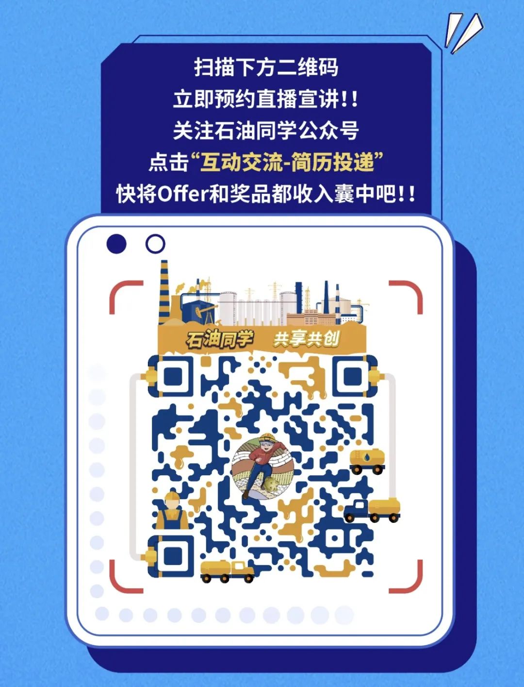 直播宣讲预约:扫码关注“石油同学”微信公众号,立即预约直播宣讲!