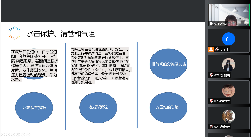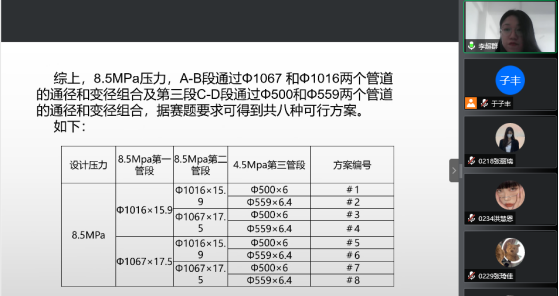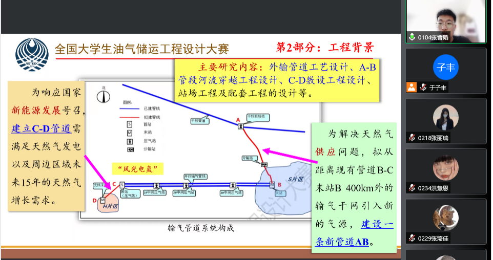 为提高我院学生在全国竞赛中参赛作品质量,我系于4月17日进行了《油气储运设计大赛》校内初赛,比赛采用线上汇报形式。此次汇报会受到了院领导的高度重视,院长李岳祥,院长助理朱砂,院督导孙国明教授和张大为教授出席了本次会议本次活动,油气储运系全体教师担当本次汇报的评委。