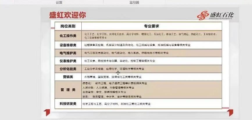 会议伊始,招聘单位通过播放宣传片、PPT展示、问答环节等方式向同学们介绍公司的概况、职业发展方向、人员需求以及选择该单位的理由等。盛虹控股集团有限公司于1992年创立于江苏省苏州市盛泽镇。集团下辖苏州、连云港、宿迁三大产业基地,业务遍及全球。旗下拥有上市公司1家,实体公司超30家,员工4万余人。2021年,盛虹集团排名“世界500强”第311位。盛虹石化产业园是盛虹控股集团倾力打造的创新型、生态型石化产业集群,是国家七大世界级石化产业基地中极具竞争力的支柱品牌。
