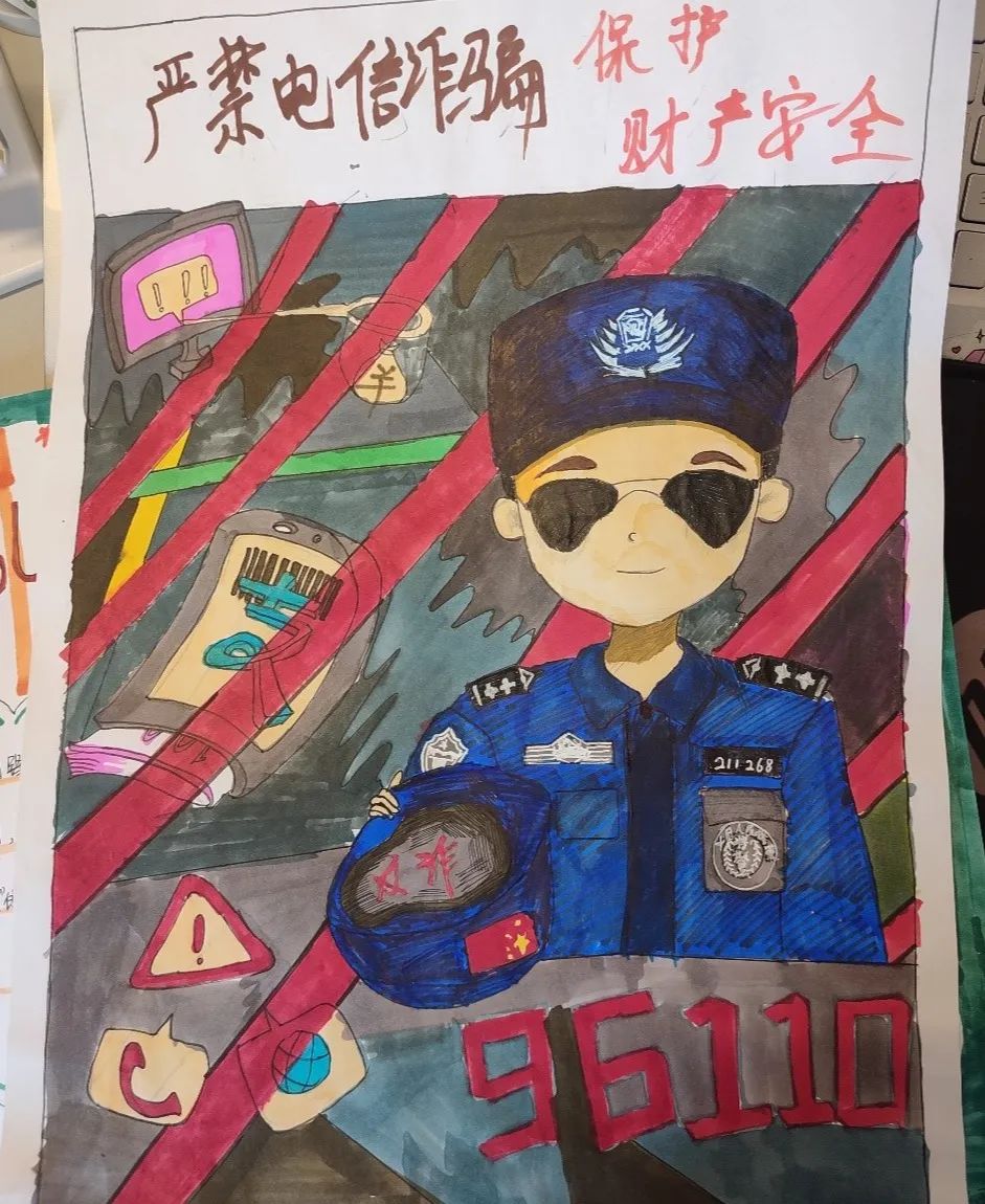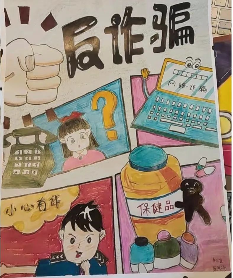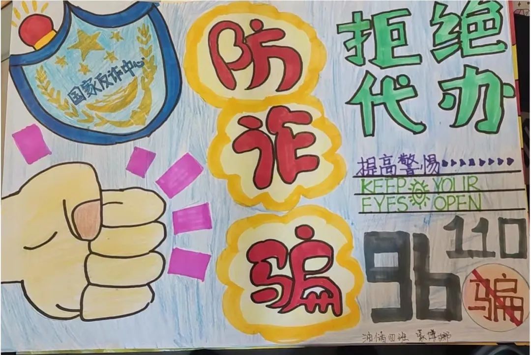 活动期间各班积极参与,同学们以“什么是电信诈骗、如何防范电信诈骗、防范电信诈骗”等知识为主题,用五颜六色的颜料画出了他们对于当下各类诈骗的警惕,并传递了各种防诈骗小常识。以丰富多彩、图文并茂的形式在手抄报上展示了保护自我财产、预防和控制诈骗犯罪等宣传内容,以文字和色彩渲染了“防诈骗”的主题。