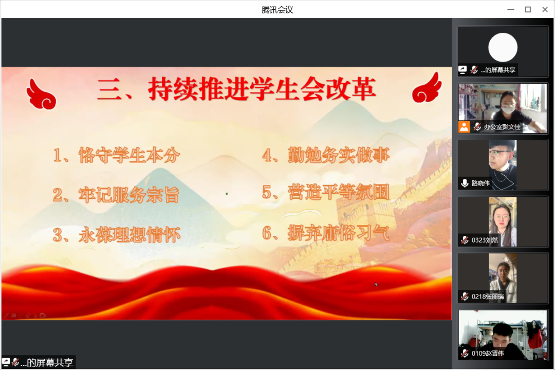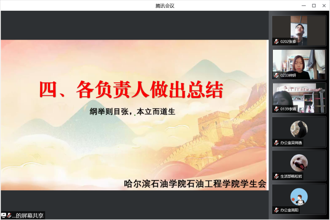 为推进学生会改革,深化学生核心思想观念,培养学生会成员综合素质,提高我院学生会综合素质水平及工作能力,我院于3月19日开展“2022年石油工程学院学生工作人员春季培训”线上活动。