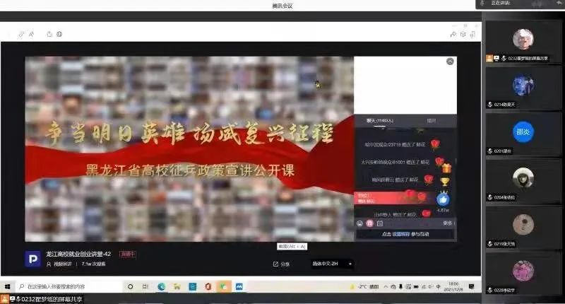 本次征兵宣传活动是学院提升大学生国防知识、强化国防意识的生动形式和具体体现。公开课利用网络直播授课的形式,主要阐述了高校大学生参兵执行的政策及参军入伍的重要性;围绕优抚优待、经济补贴、学业发展、就业扶持四个方面为同学们详细讲解了黑龙江省的优抚优待政策及入伍流程。观看结束,大家反响热烈,纷纷表示,深深被龙江军人的精神所感染,认为参军入伍是一次改变命运的难得机会,是一个提升能力的成长平台,是一段丰富多彩的人生经历。